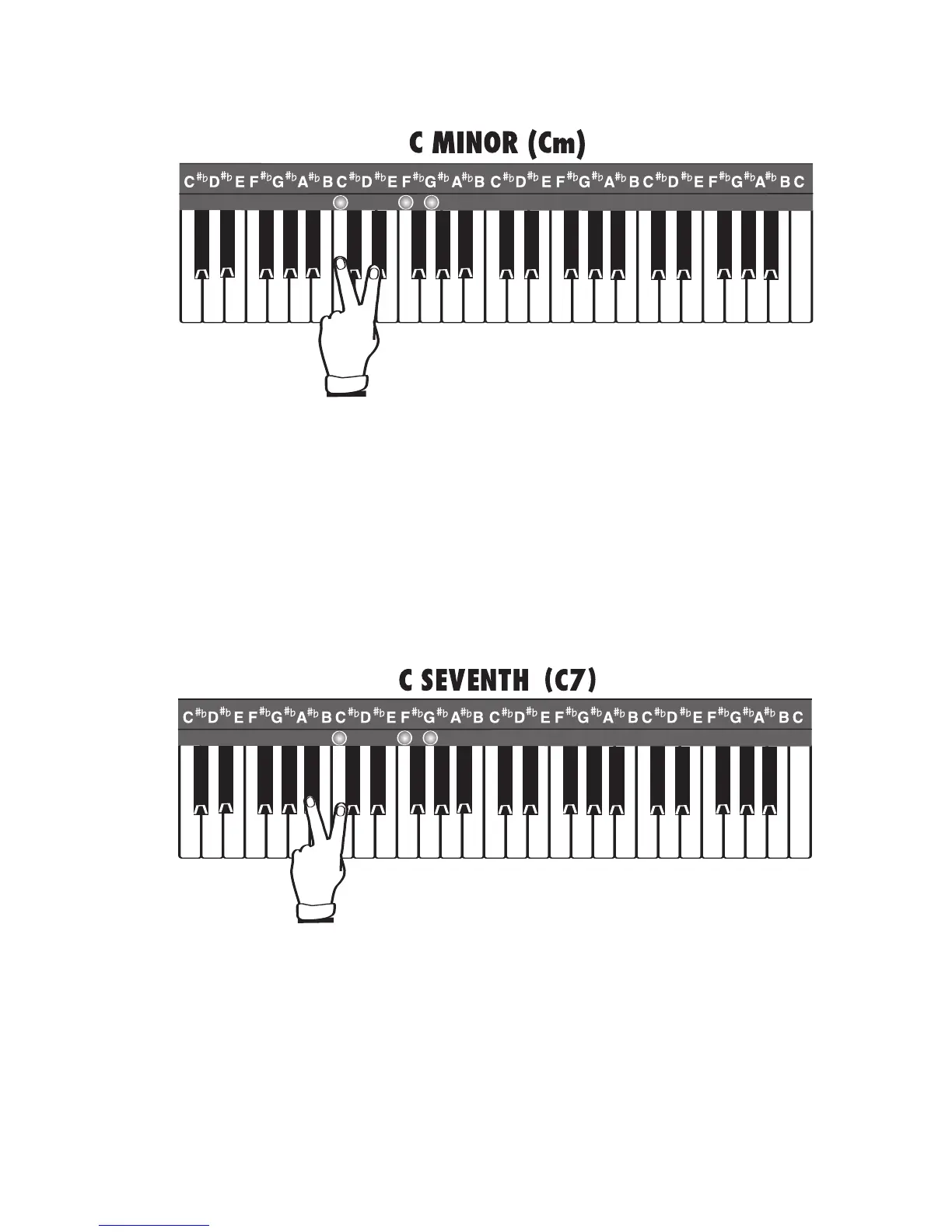 For example, to play a C7 chord, you need to play a C note and the B flat note to the left of that C note. Be