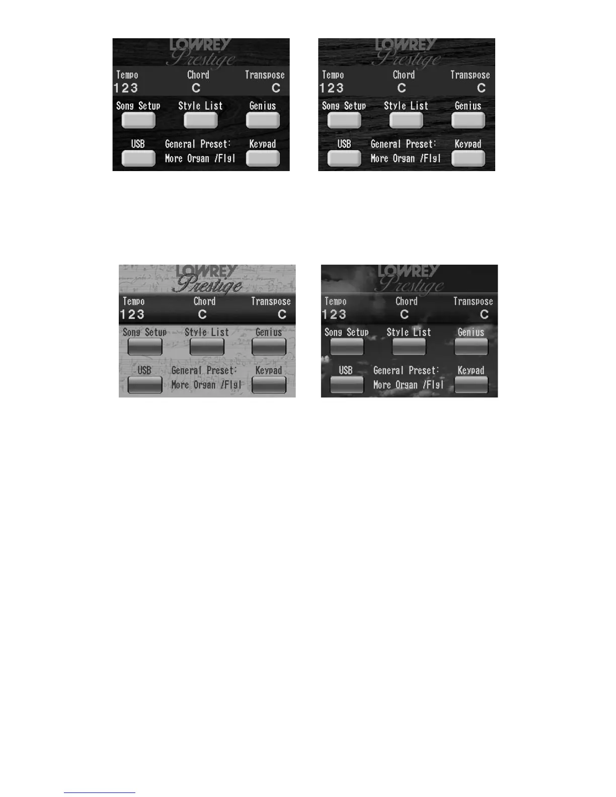 PRESTIGE LOGO - Displays the Prestige image that is seen when the organ is first turned on.