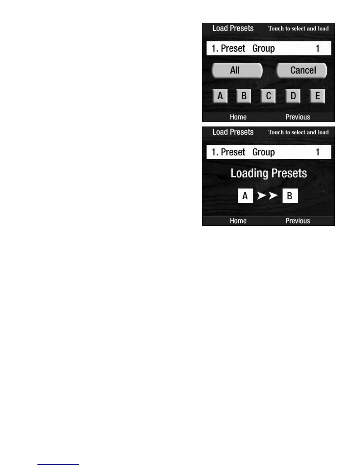 6. Press the Bank Preset letter on the screen. The screen will confirm that the Preset Group was loaded
