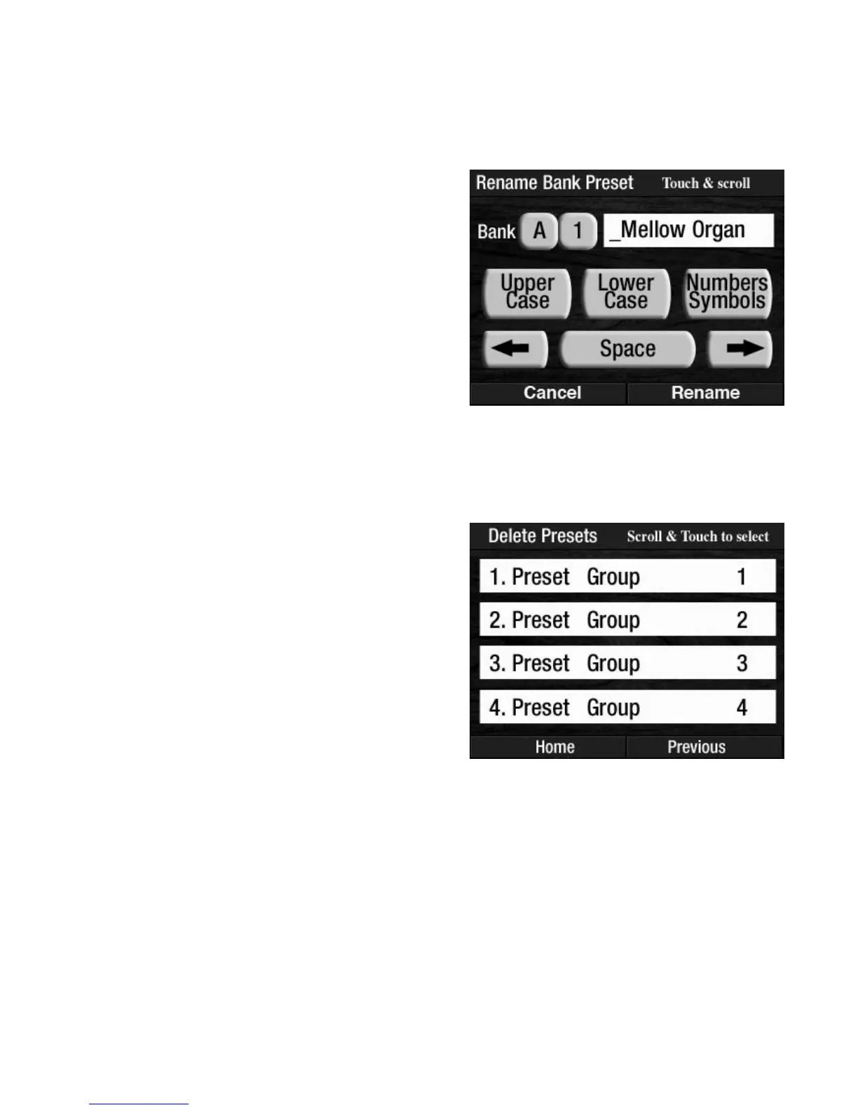 Pressing the words RENAME PRESETS on the screen displays the names of groups of Bank Presets saved on