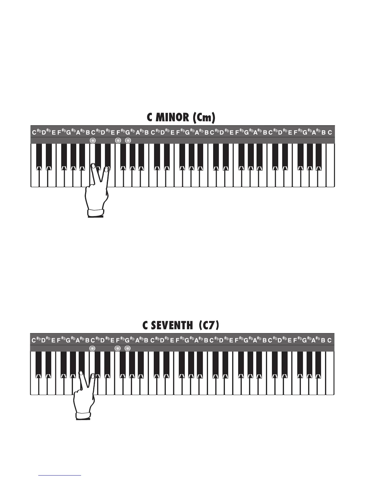 For example, to play a Cm ( C Minor) chord, you need to play a C note and the E FLAT note to the right of