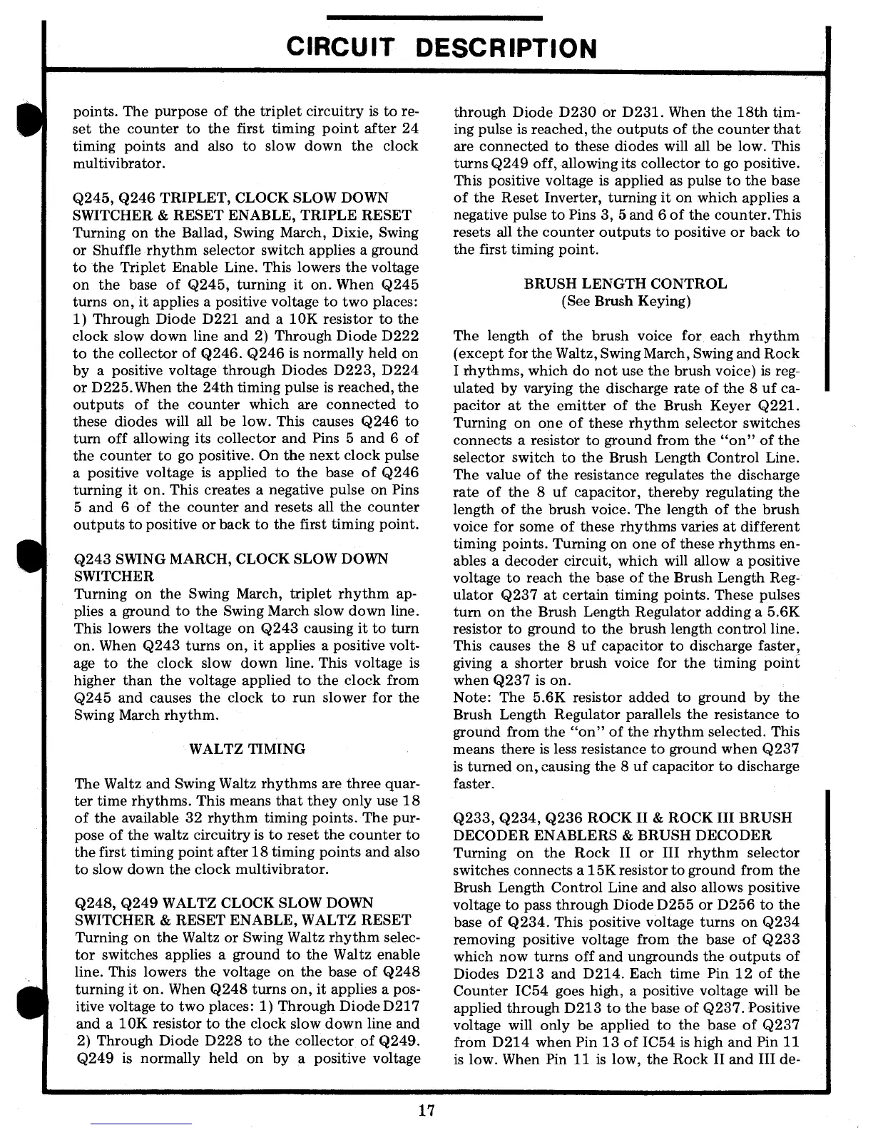Lowrey SCT - Q245, Q246 Triplet, Clock Slow Down Switcher & Reset Enable, Triple Reset; Waltz Timing; Brush Length Control (See Brush Keying); Q233, Q234, Q236 Rock II & Rock III Brush Decoder Enablers & Brush Decoder
