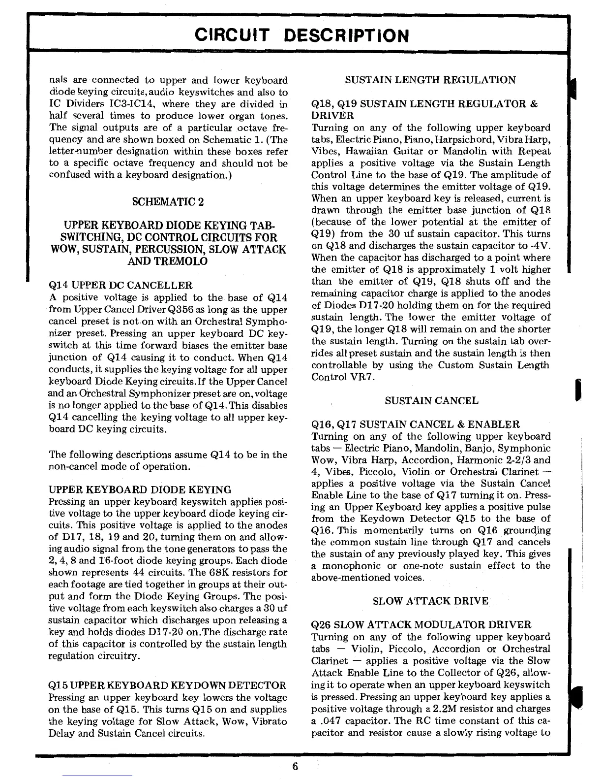 Lowrey SCT - Upper Keyboard Diode Keying Tab-Switching, DC Control Circuits for Wow, Sustain, Percussion, Slow Attack and Tremolo; Sustain Length Regulation; Sustain Cancel; Slow Attack Drive