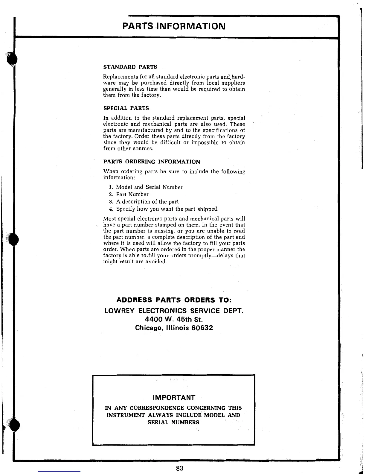 Lowrey SCT - Parts Information; Standard Parts; Special Parts; Parts Ordering Information