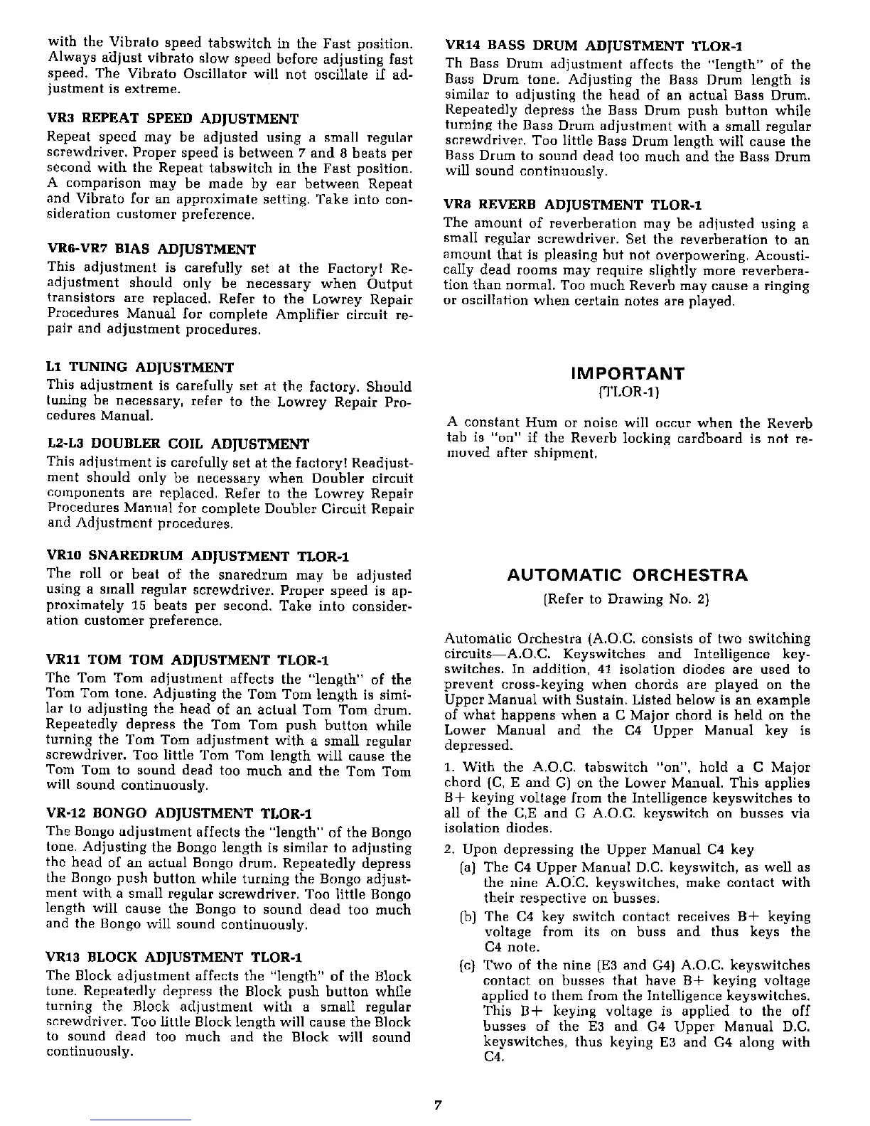 Lowrey Tlo-1 - Repeat Speed Adjustment Procedure; Bias Adjustment for Output Transistors; Master Oscillator Tuning; Doubler Coil Adjustment
