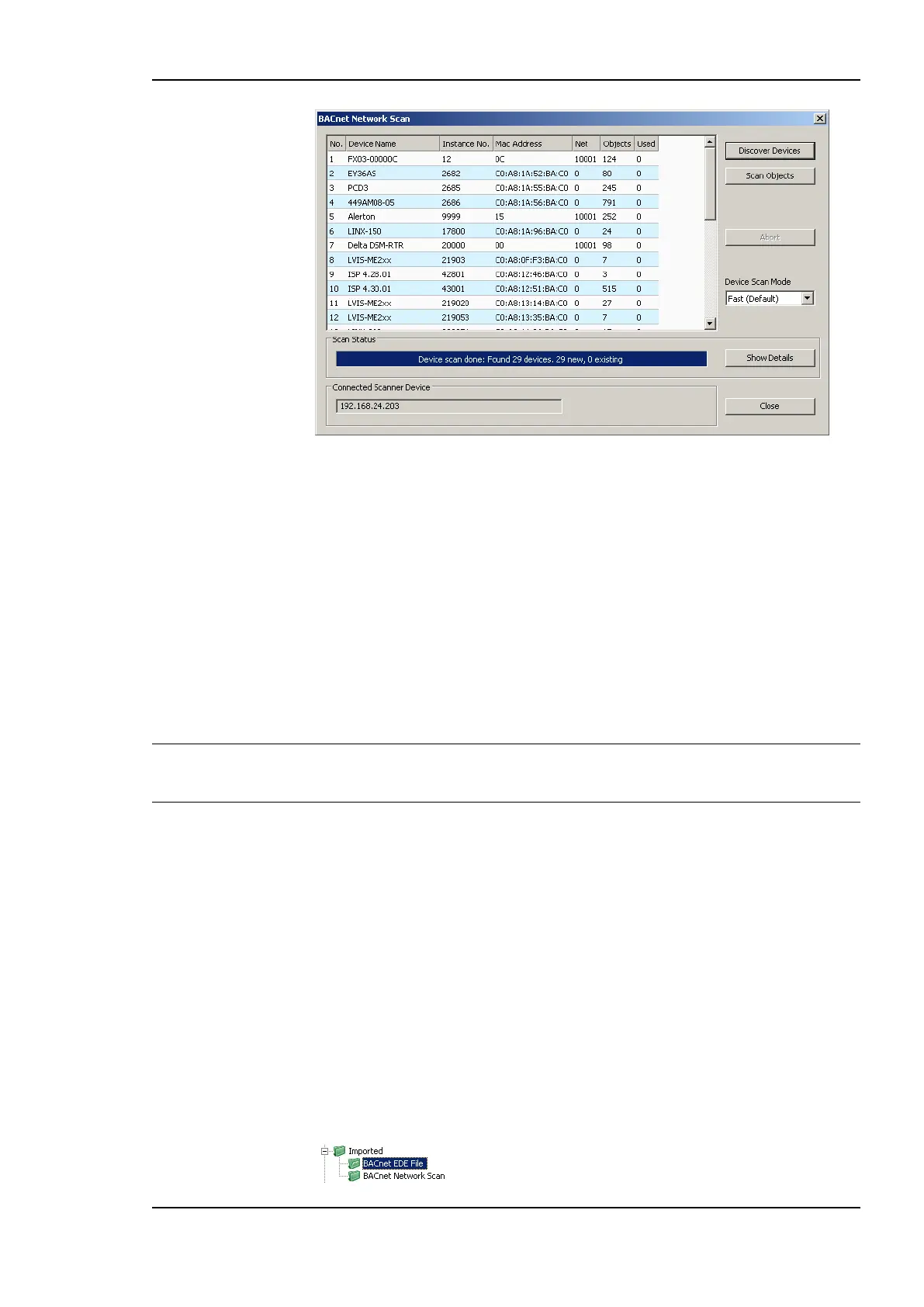 BACnet objects on the selected device and adds them to the BACnet Network Scan