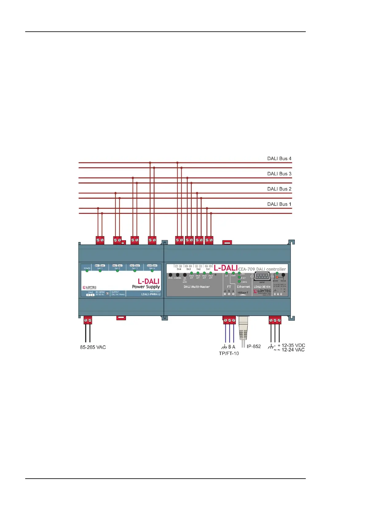 Connect the L-DALI to the power and to the DALI network as shown in Figure 5. To allow