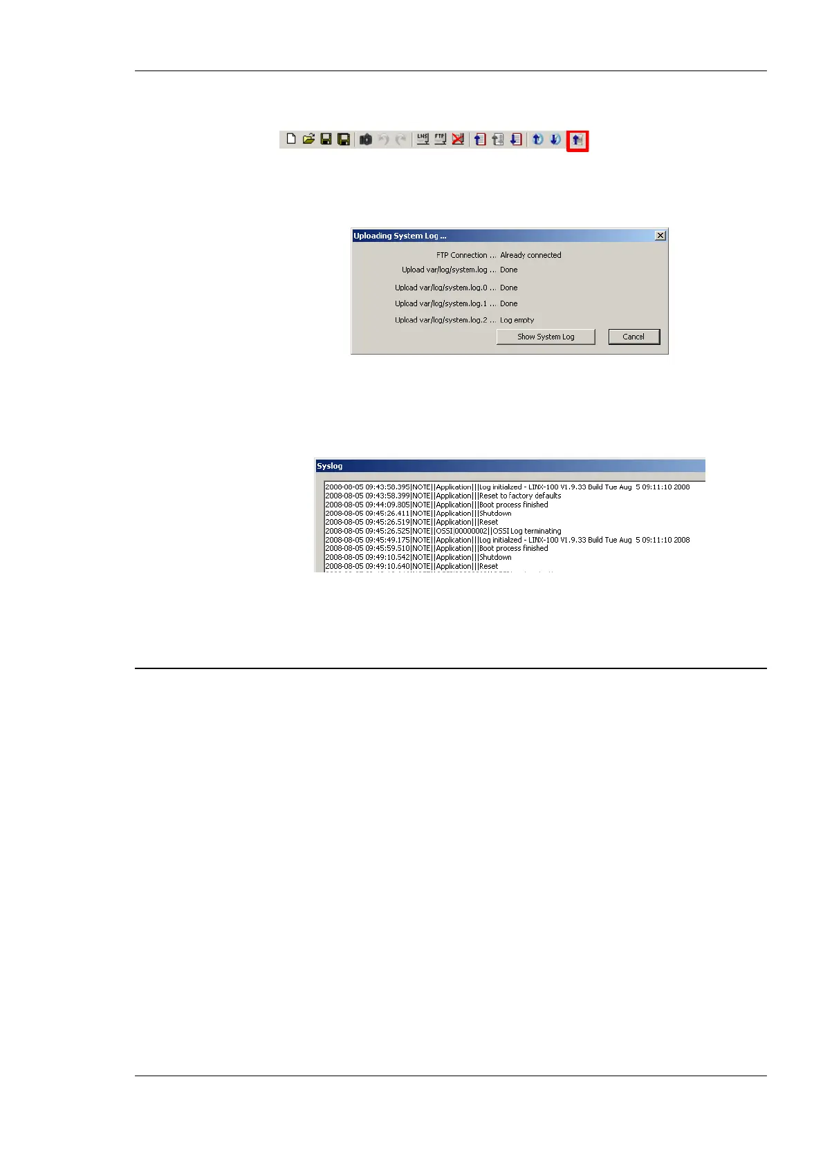 in the tool bar. The upload system log dialog as shown in Figure 87 opens showing the
