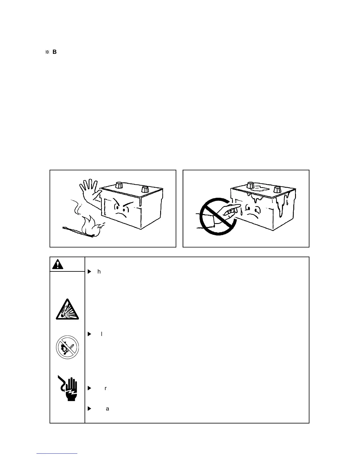 - Keep cigarettes, sparks and flames away from battery. Use a flashlight to check