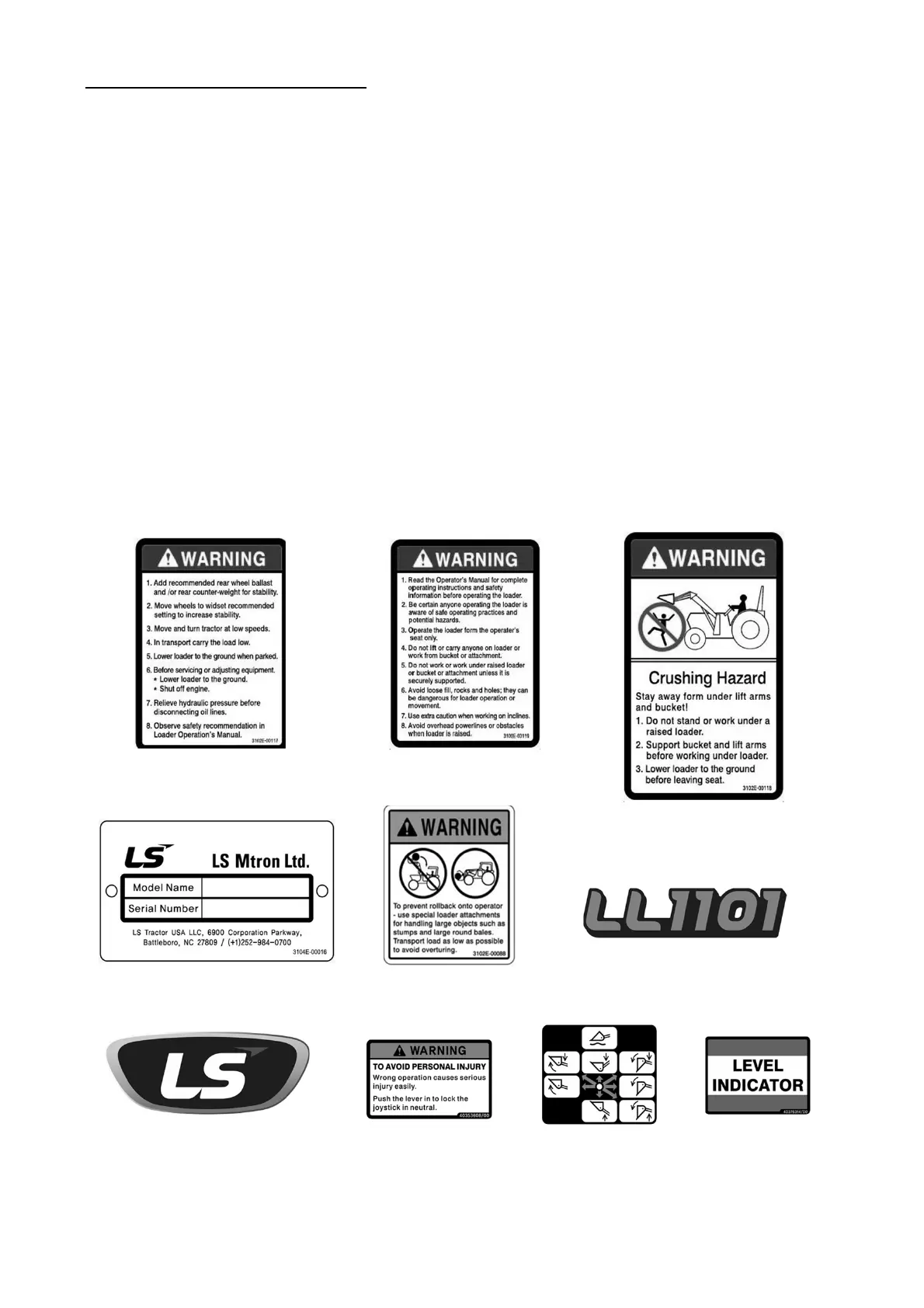 Decal 3102E-00118, 3102E-00119, located on the loader left hand Mid-Mountarevisiblewhen