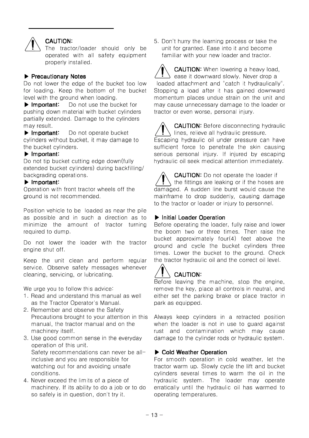 tractor warm up. Slowly cycle the lift and bucket