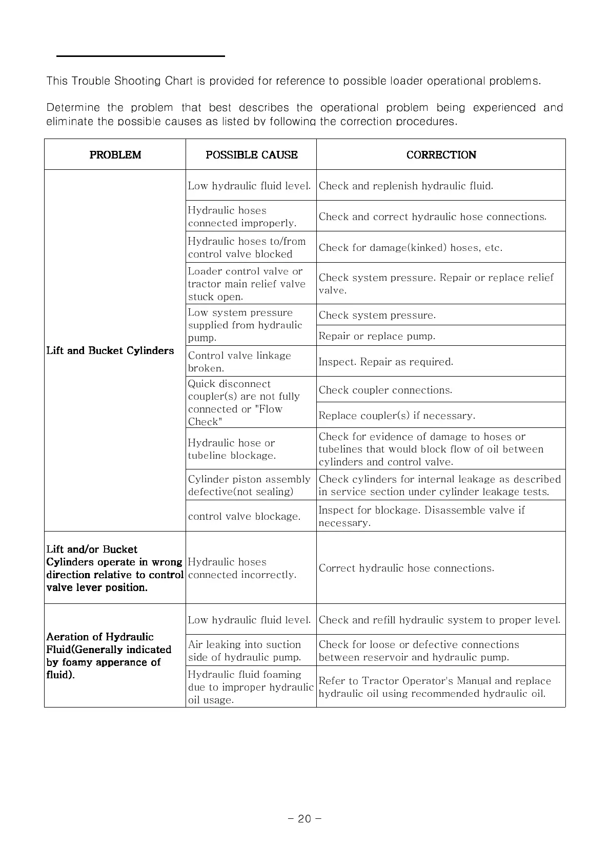 This Trouble Shooting Chart is provided for reference to possible loader operational problems.