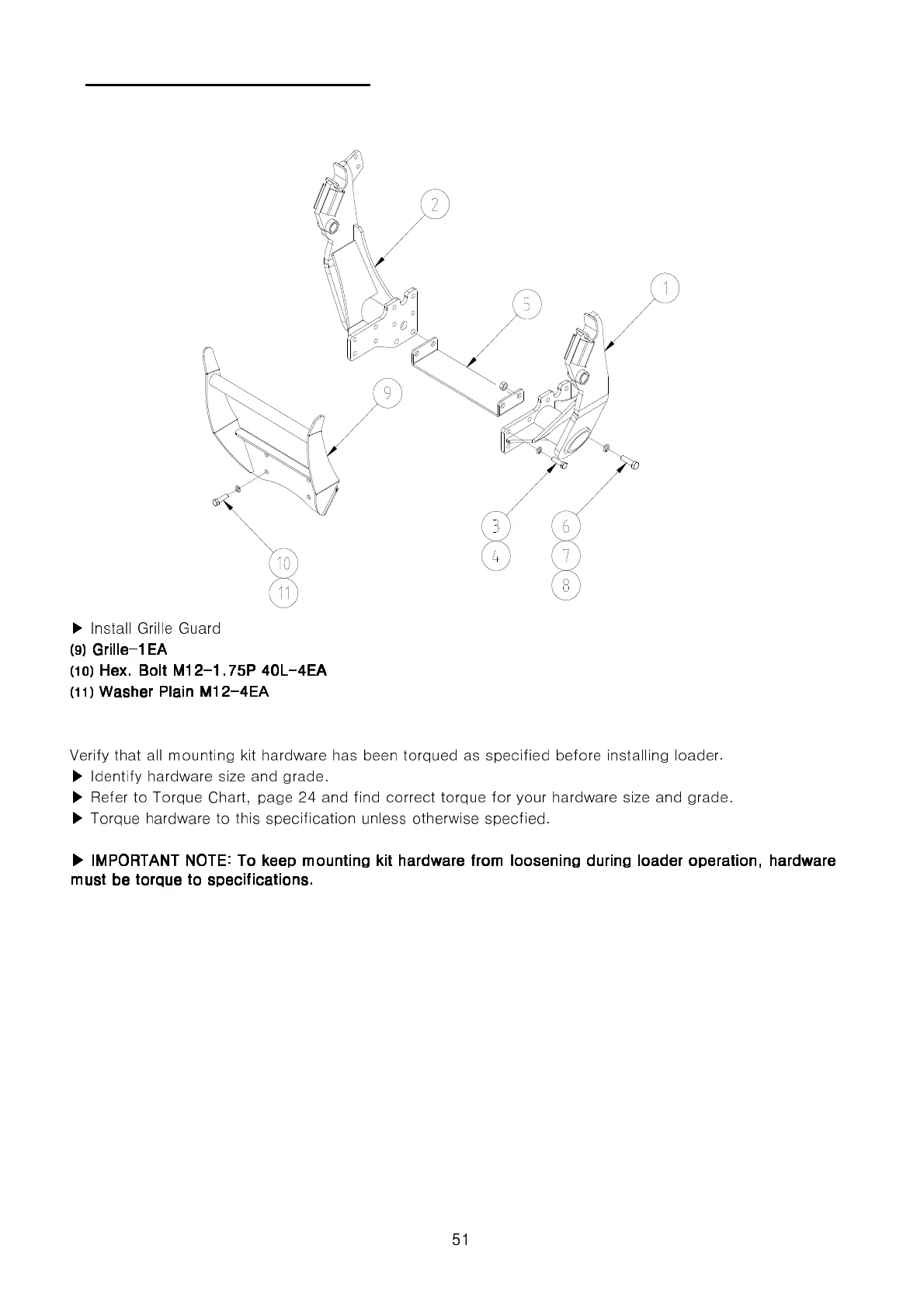 ▶ IMPORTANT NOTE: To keep mounting kit hardware from loosening during loader operation, hardware