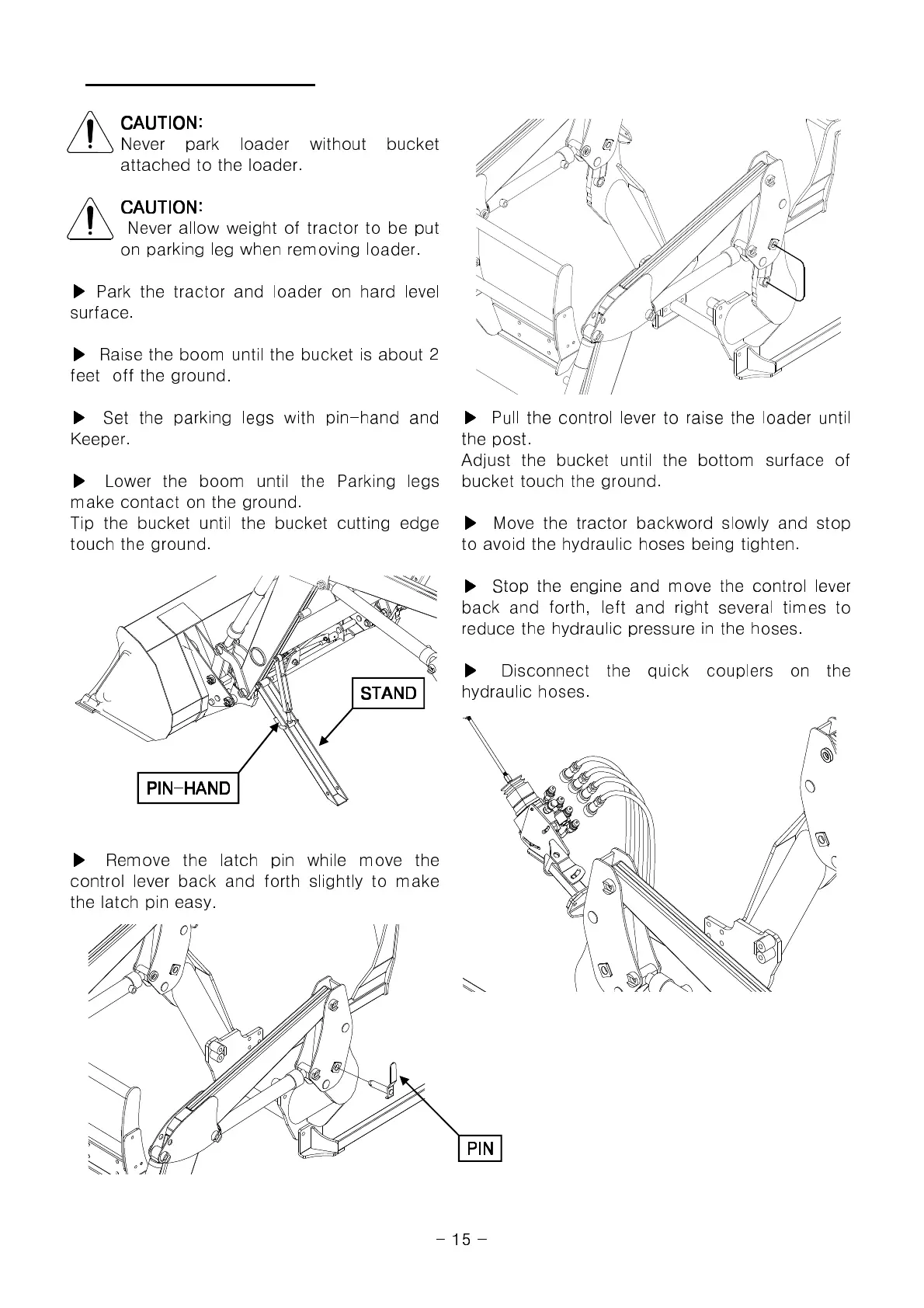 Park the tractor and loader on hard level