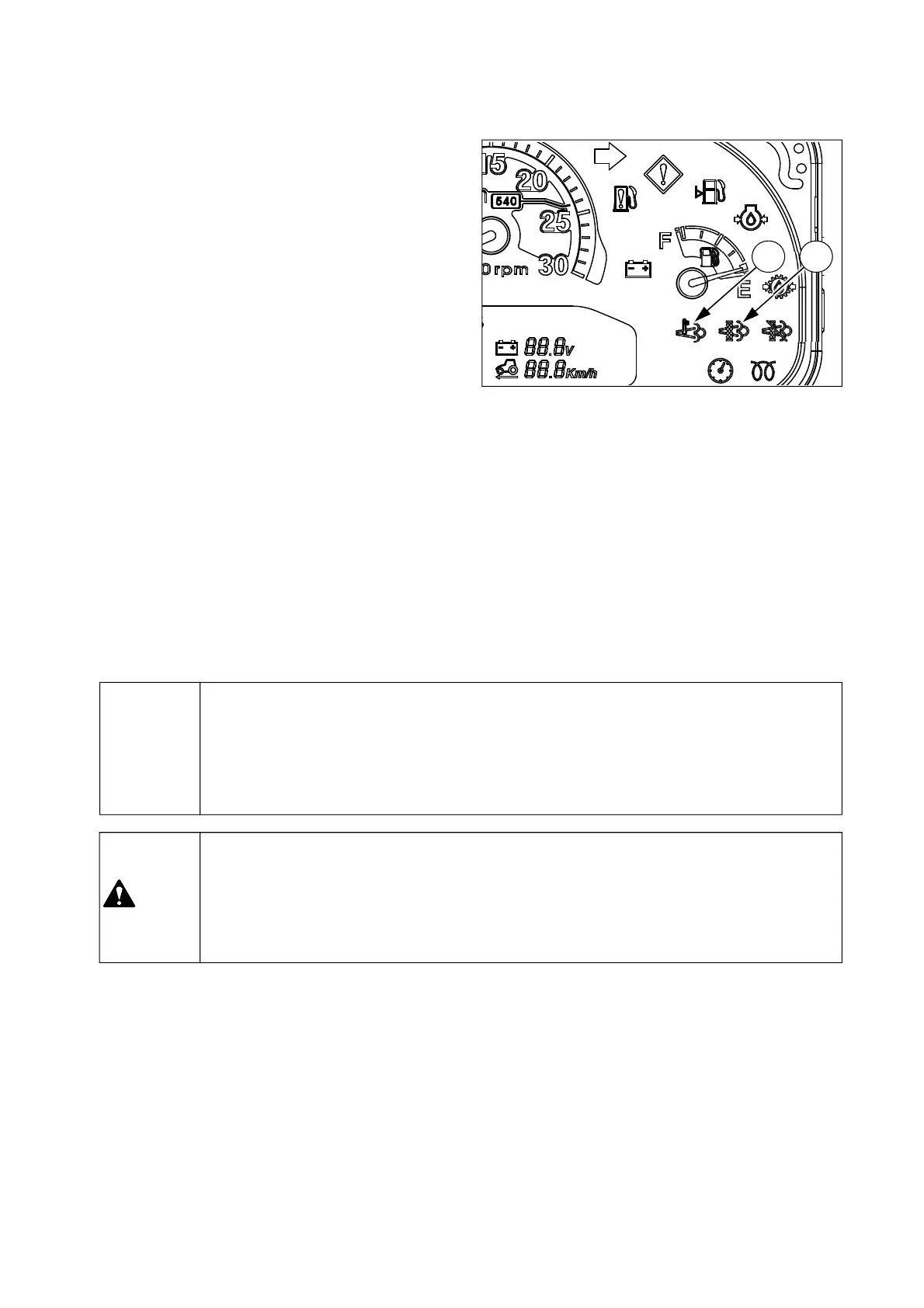 During the regeneration, the DPF regeneration indicator(1) and DPF temperature indicator(2) will be