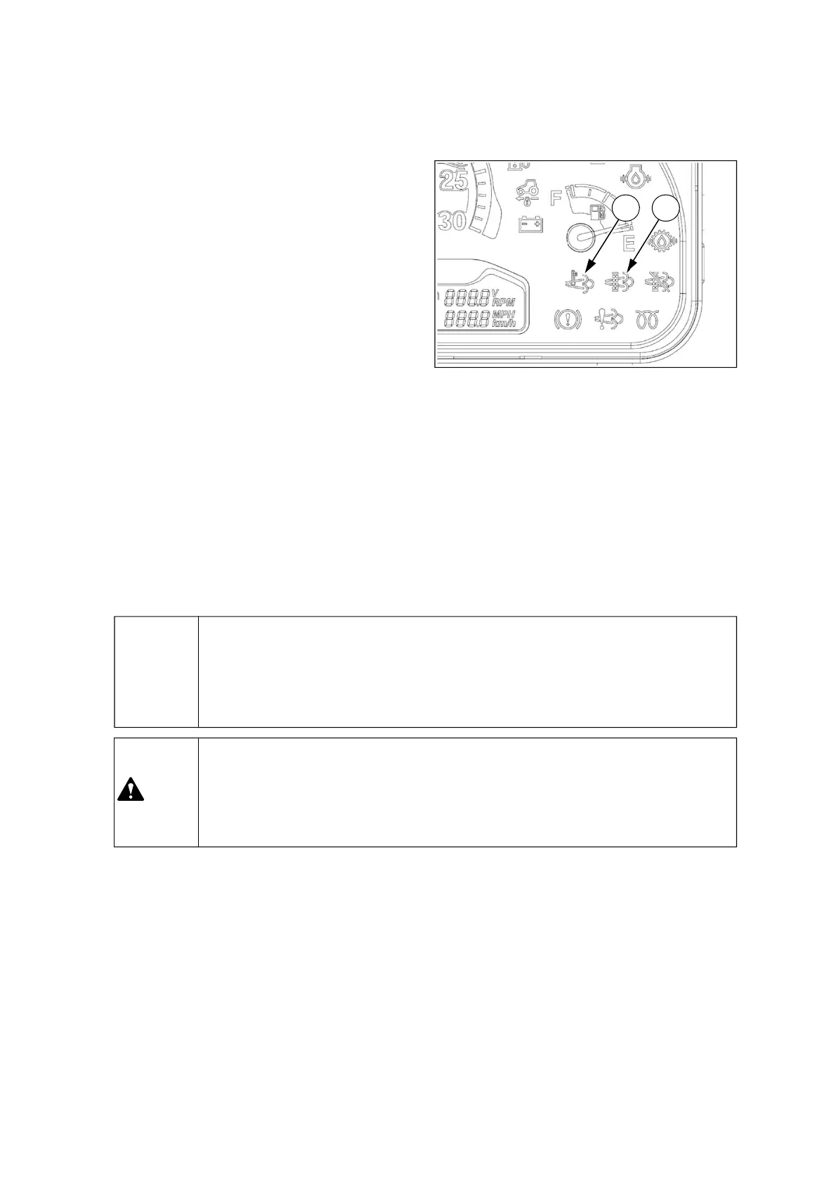 During the regeneration, the DPF regeneration indicator(1) and DPF temperature indicator(2) will be