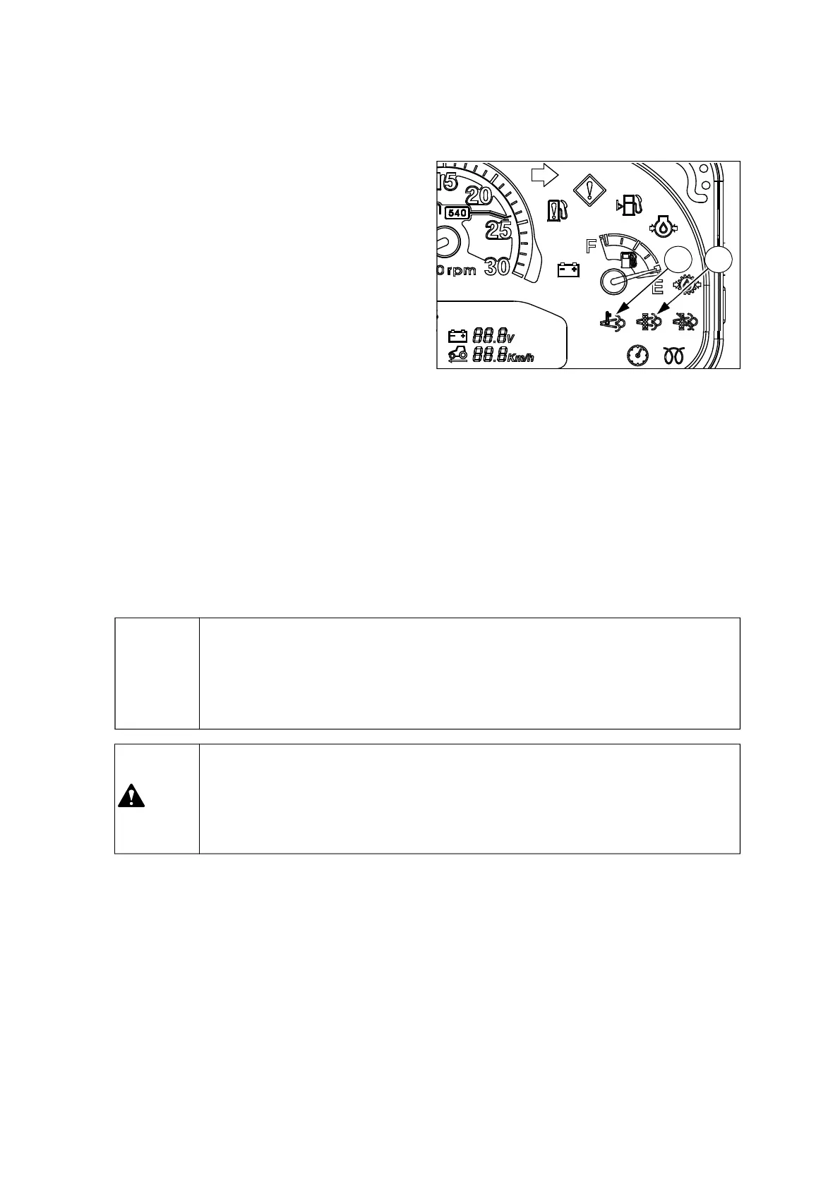 During the regeneration, the DPF regeneration indicator(1) and DPF temperature indicator(2) will be
