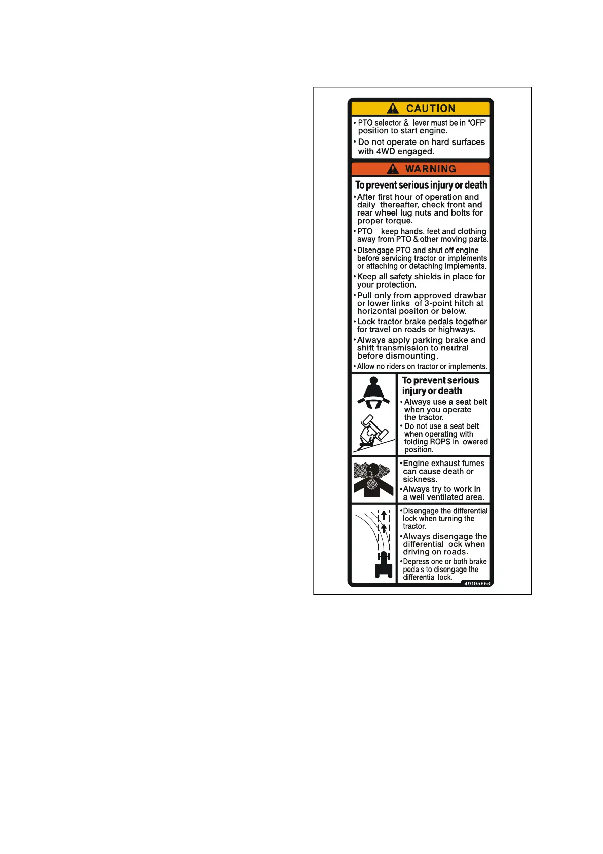 • PTO - keep hands, feet and clothing away from