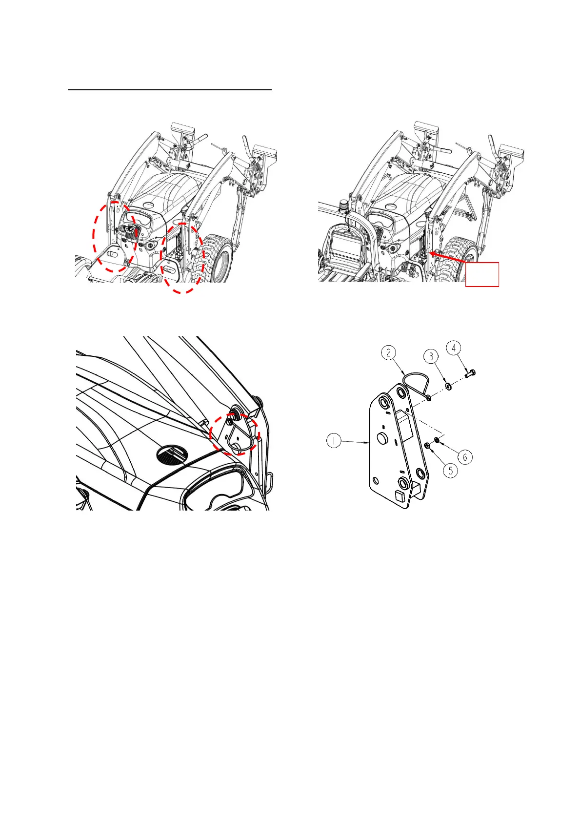 8. Install the hose guide(2) on the loader boom(1), secure with M10x30L bolt(4), M10 plain washer(3), M10 spring