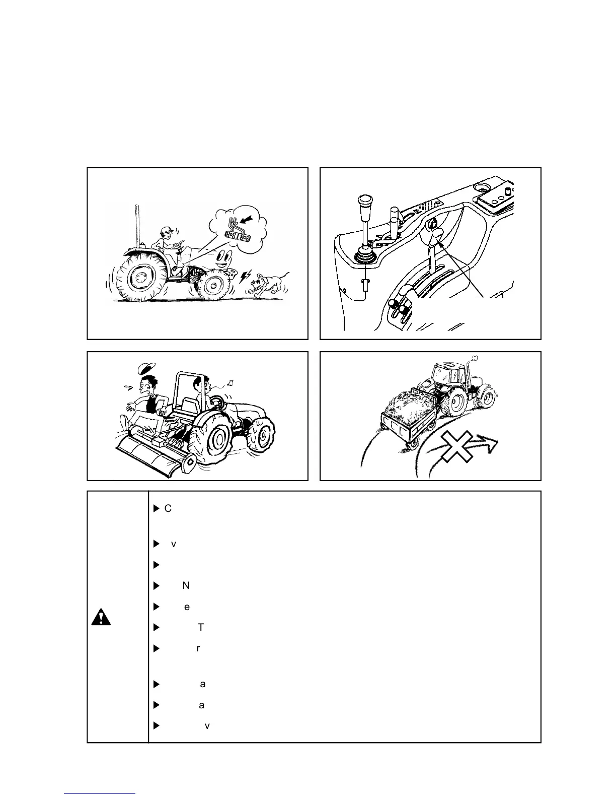 While traveling, DO NOT operate any implement such as tiller, loader etc.