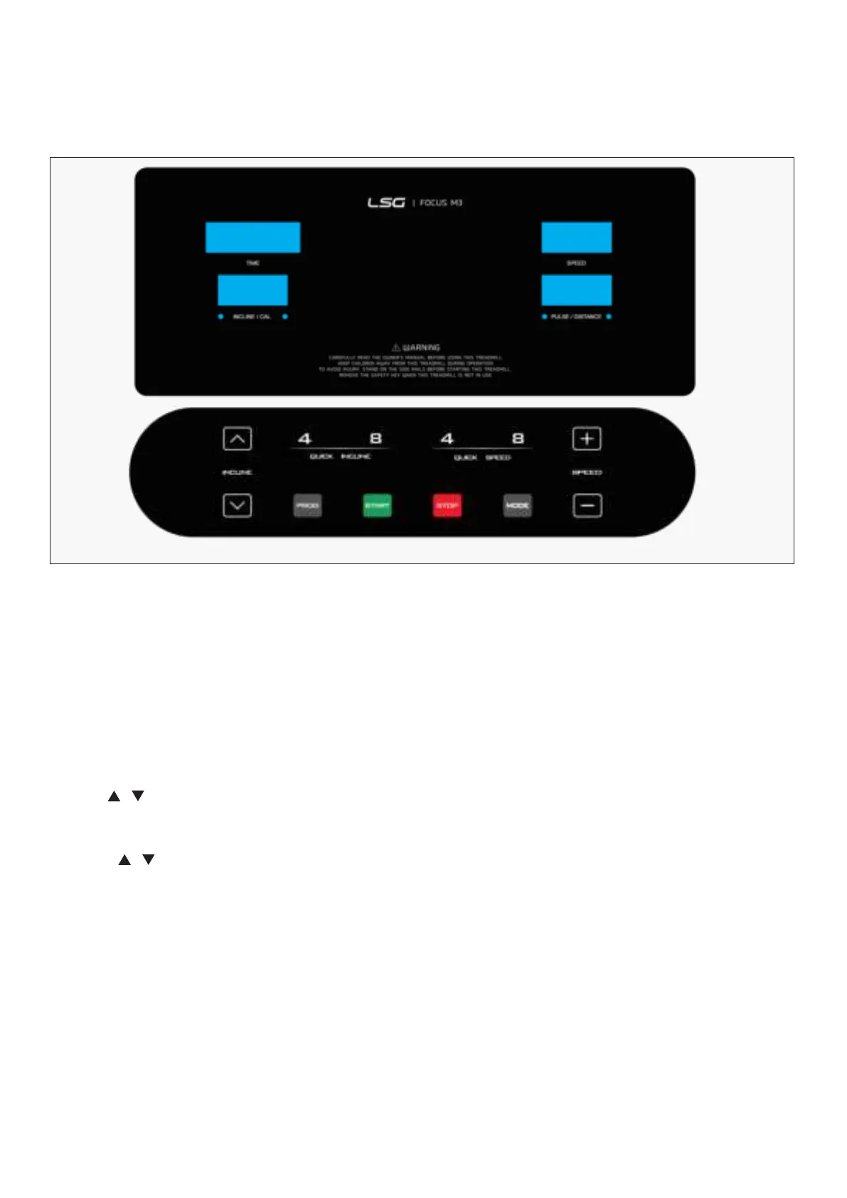 INCLINE , : Adjust the incline. Press the button to adjust the incline when running and adjust