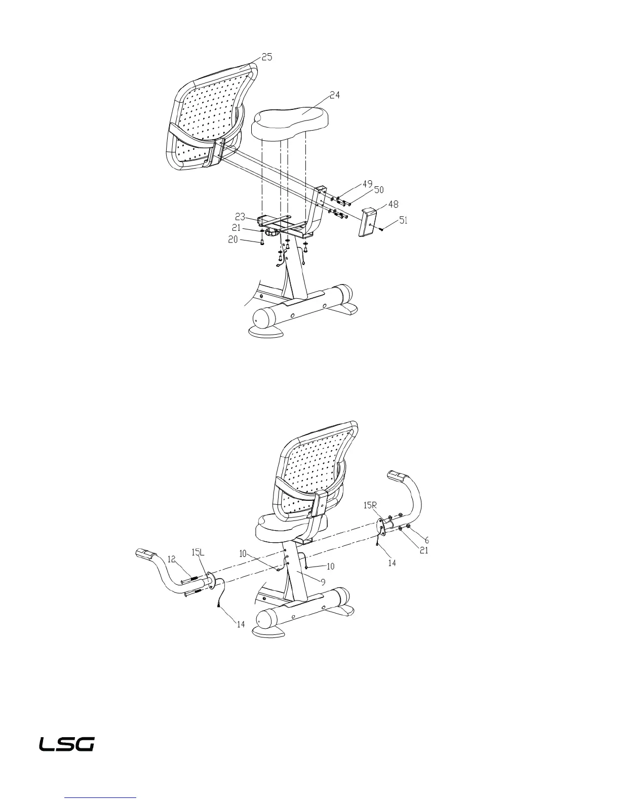 1. Lock the saddle (24) on the seat frame (23) with screw (20) and flat washer (21).