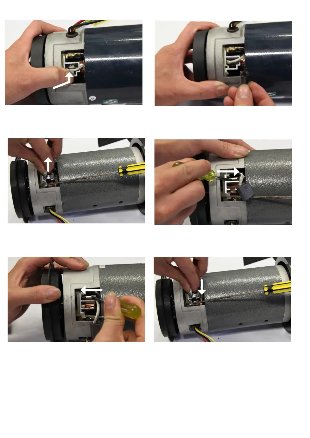 7. Plug the new motor brush lead into the terminal. 8. Slide the new motor brush into the slot.