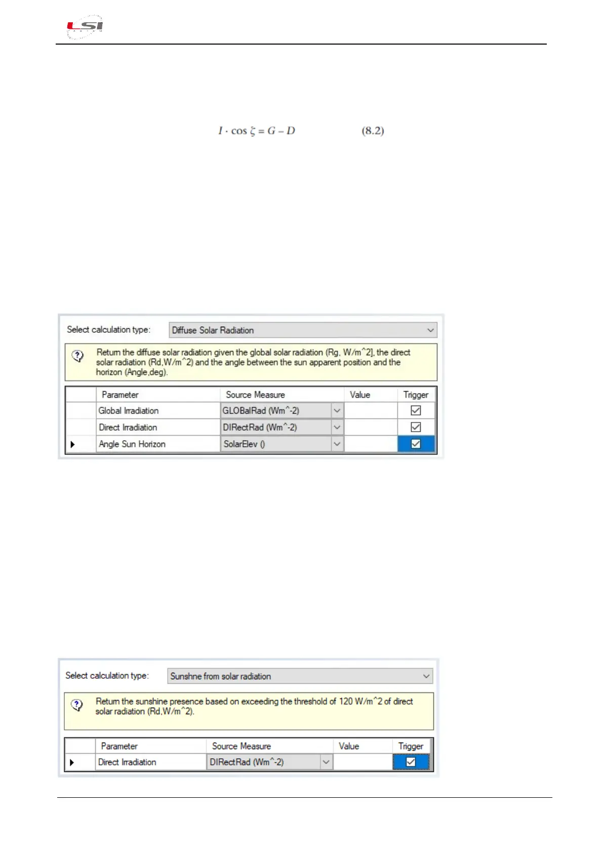 global, direct and diffuse solar radiation. The formula given is 8.2: