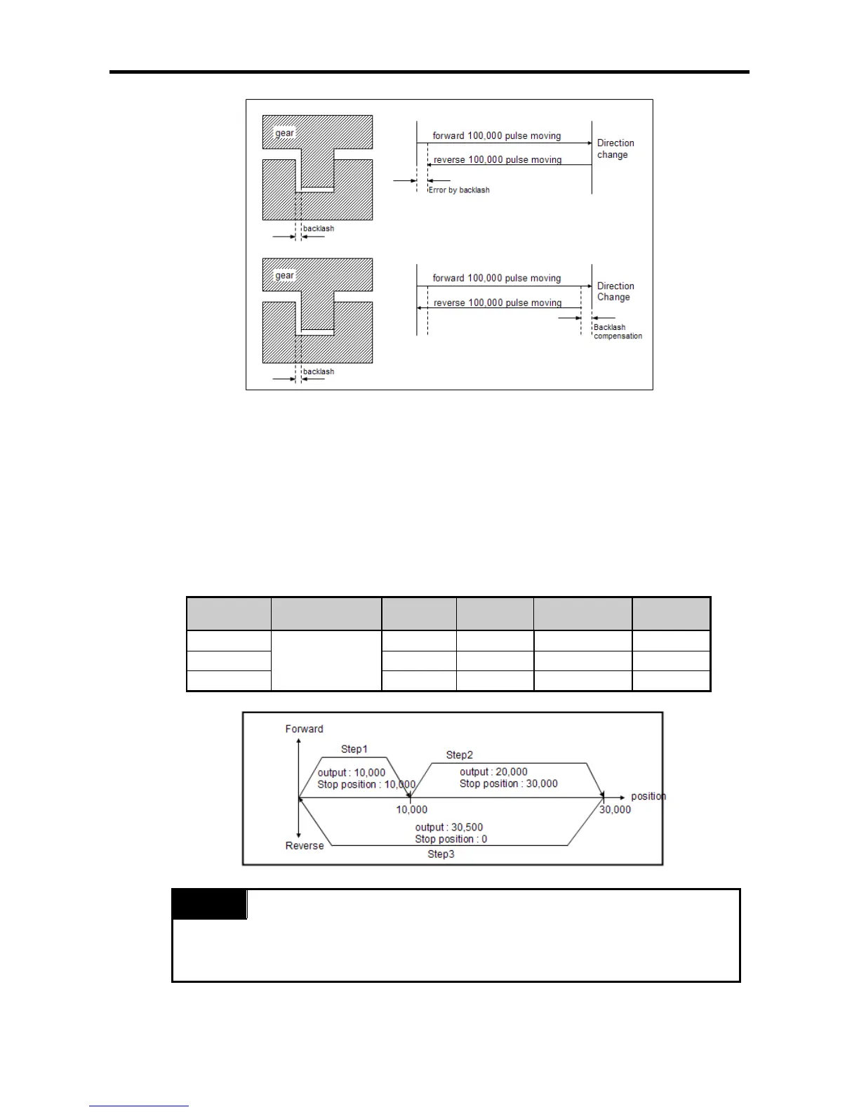 • The following table indicates real pulse output and stop position in case of setting backlash.