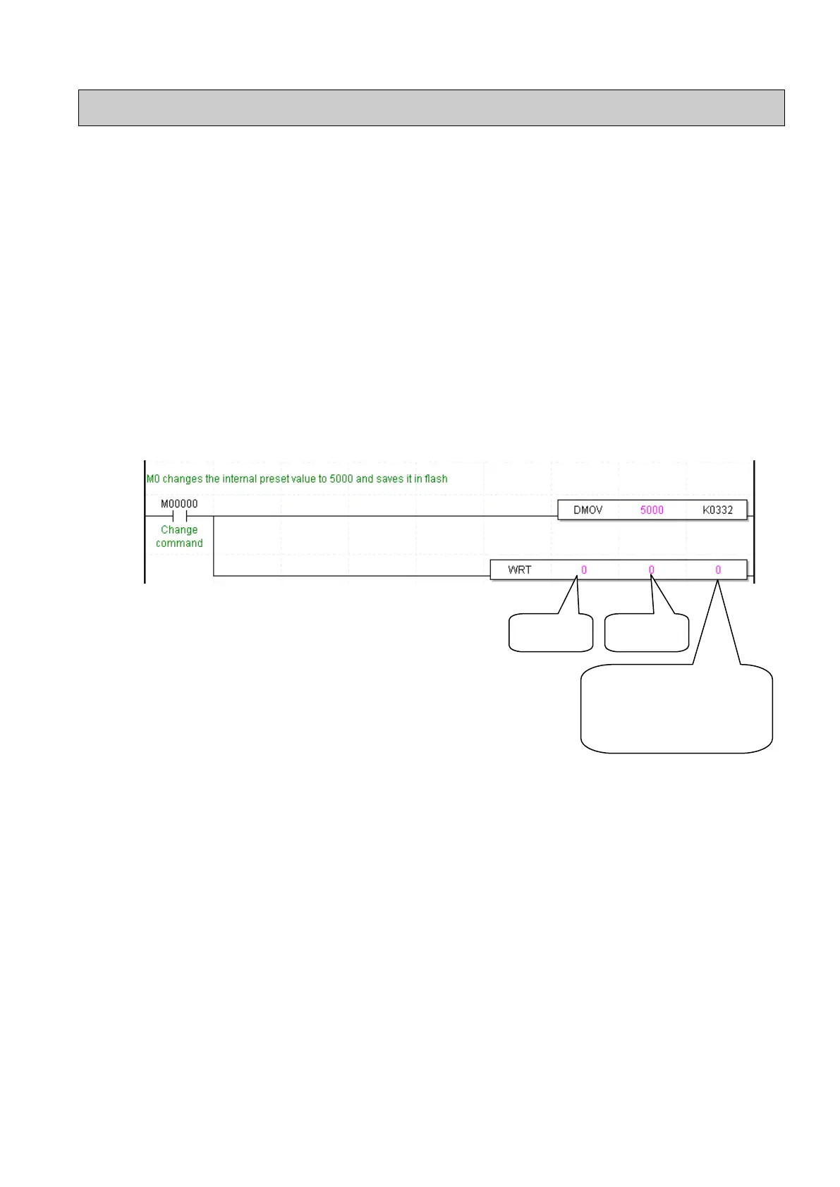 - Receiving an order command (M000), it moves (MOV) the new internal preset value (5000) to the