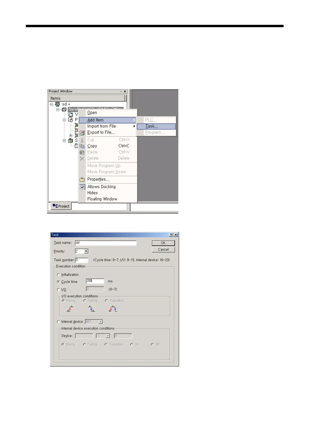 Generate the task in the project window of XG5000 as below and add the program to be performed by each