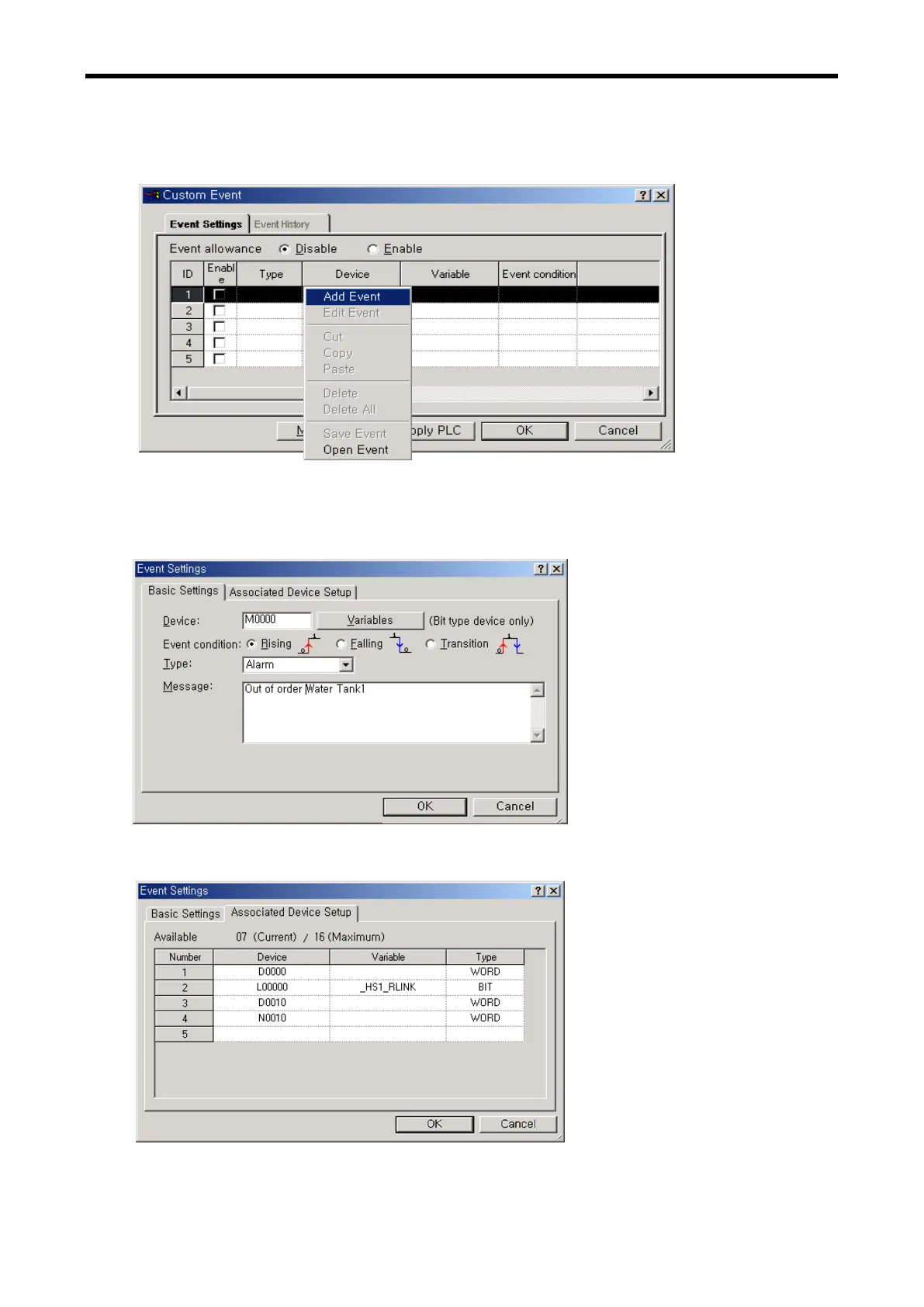 If rising edge of M0000 device occurs, it records the message of an alarm, “Out of order Water Tank 1”