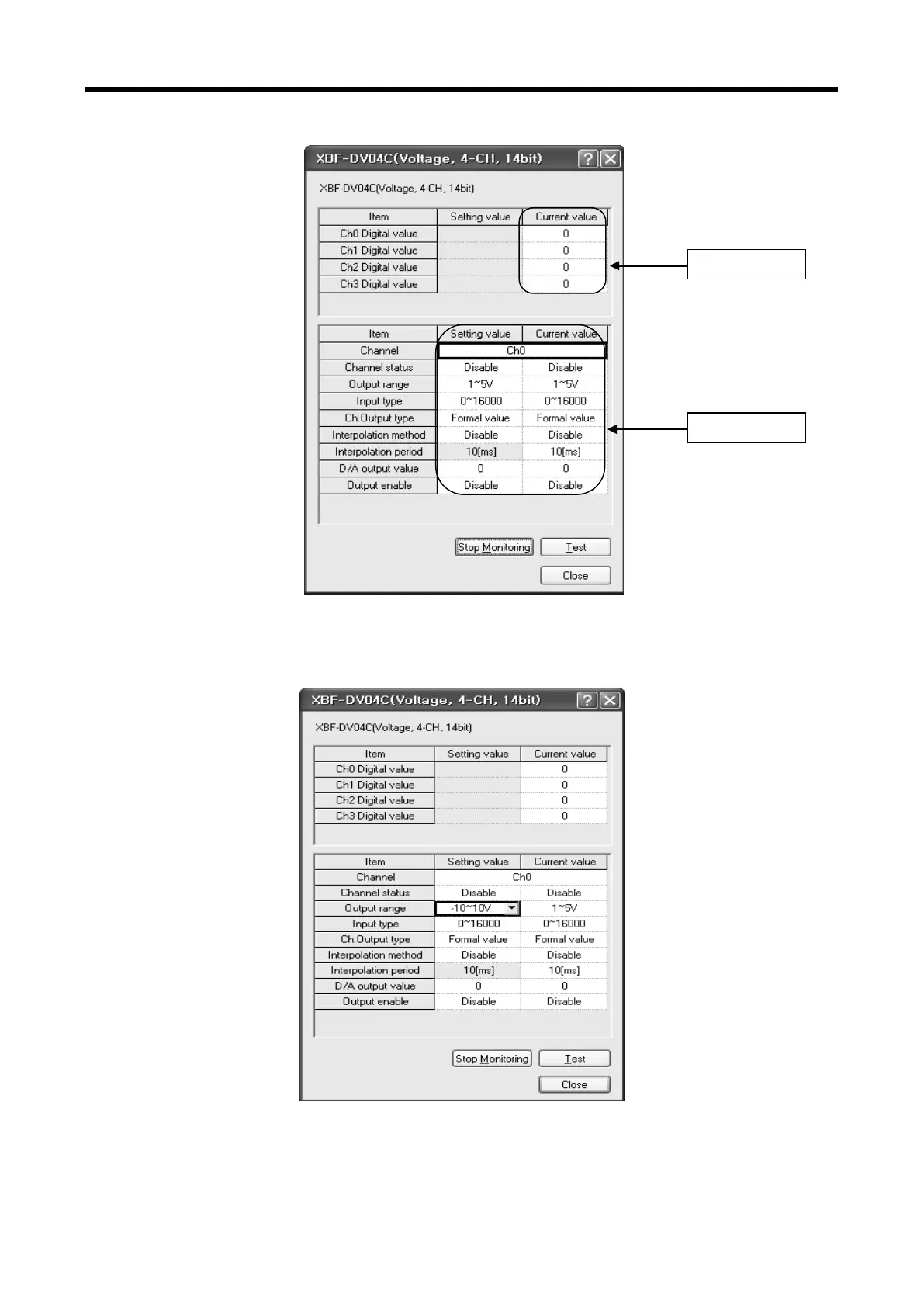 (6) [Close] is used to escape from the monitoring/test screen. The Max value, Min value,
