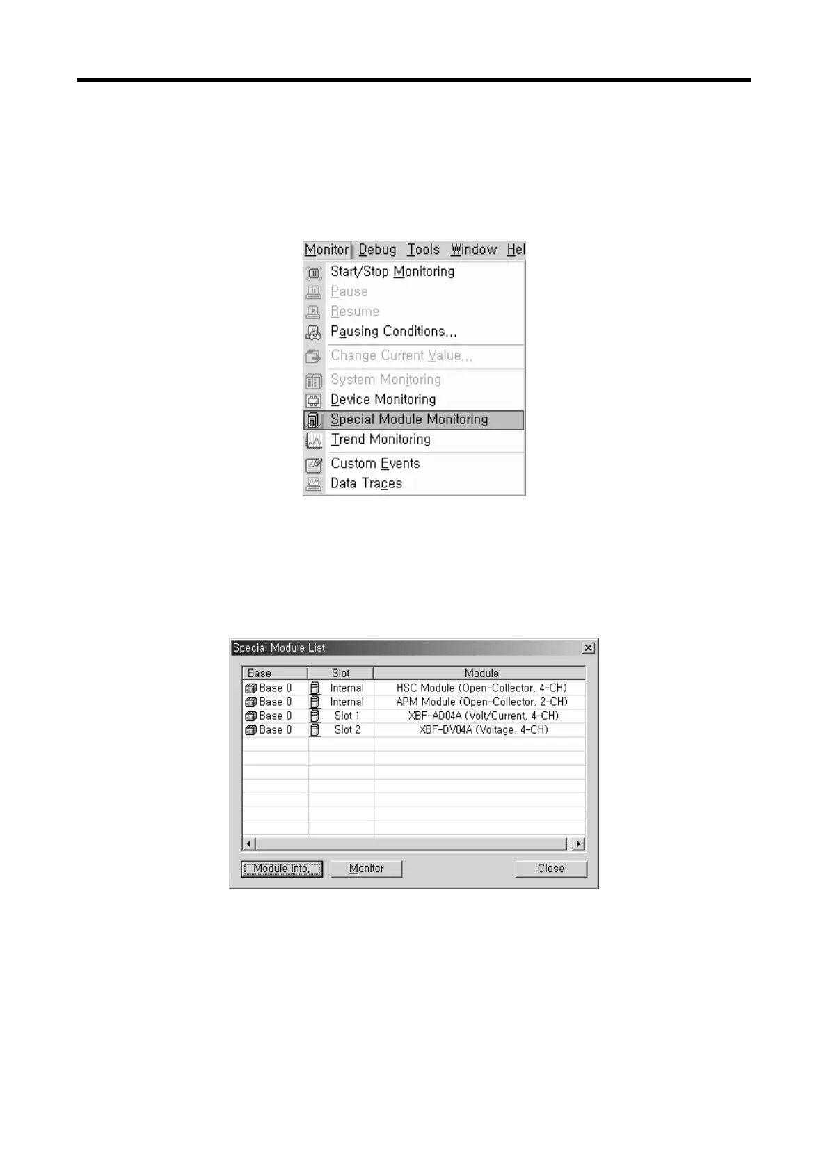 Monitoring] to display ‘Special Module Select’ screen as in Fig. 5.1 showing base/slot