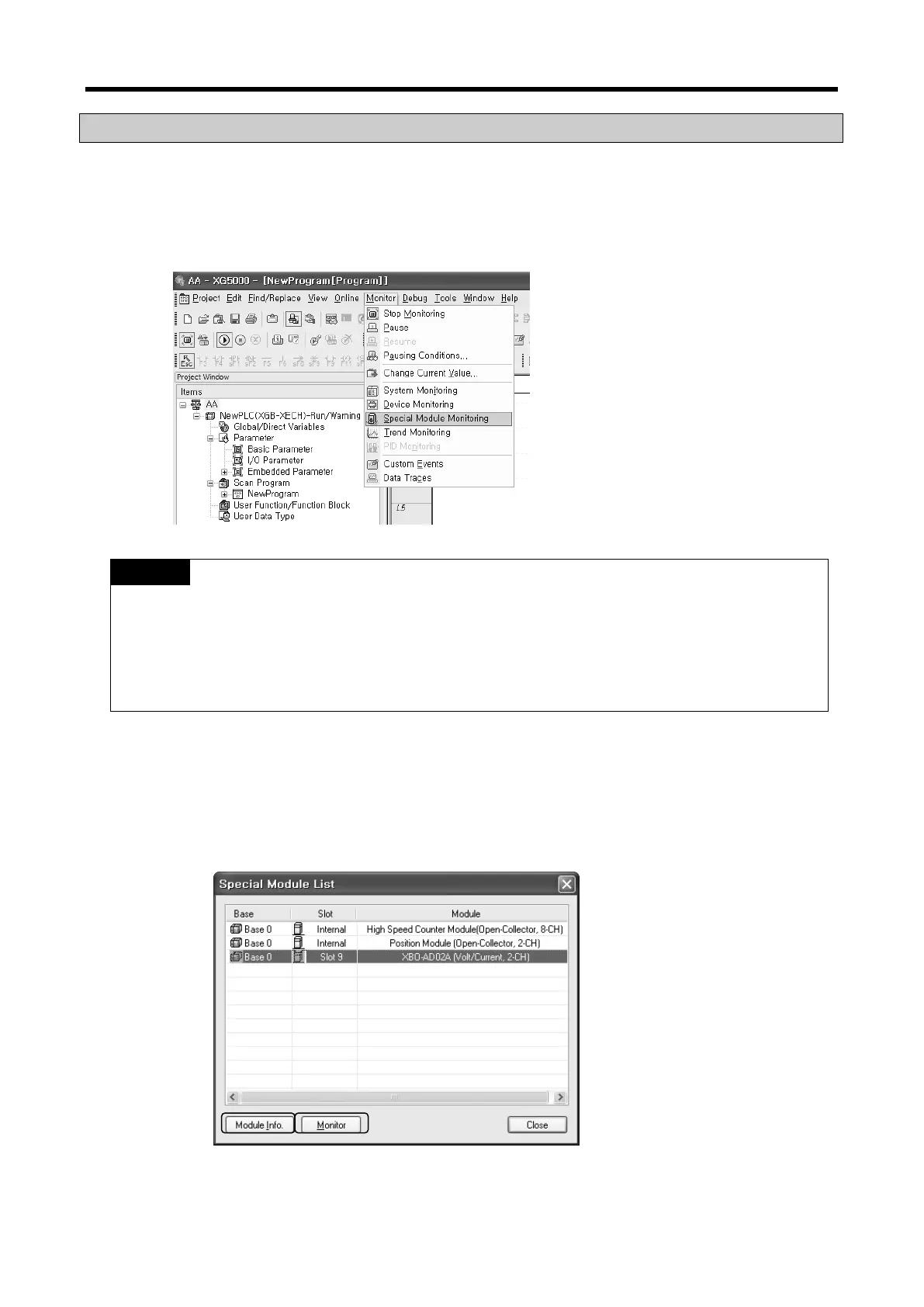 Select [Online] -> [Connect], and [Monitor] -> [Special Module Monitor] to start up. [Special Module