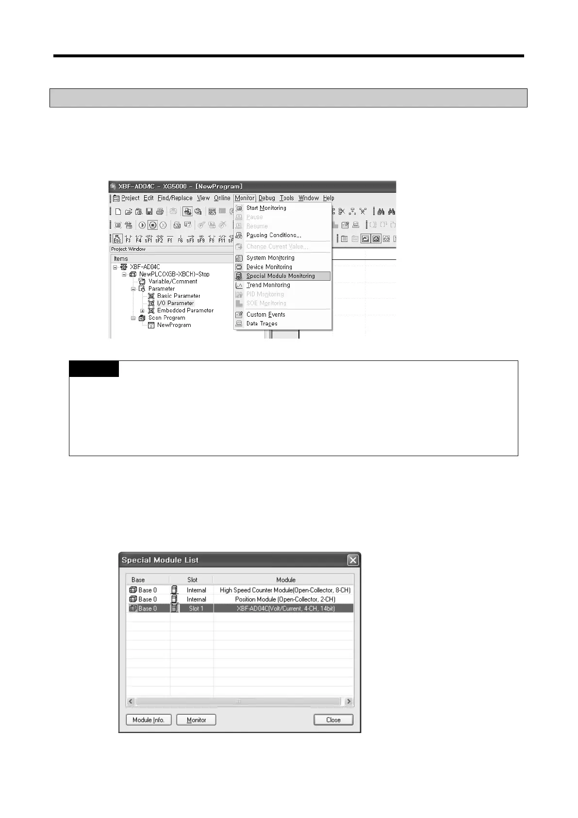 (1) With XG5000 connected to PLC CPU (on-line status), click [Monitor] -> [Special Module