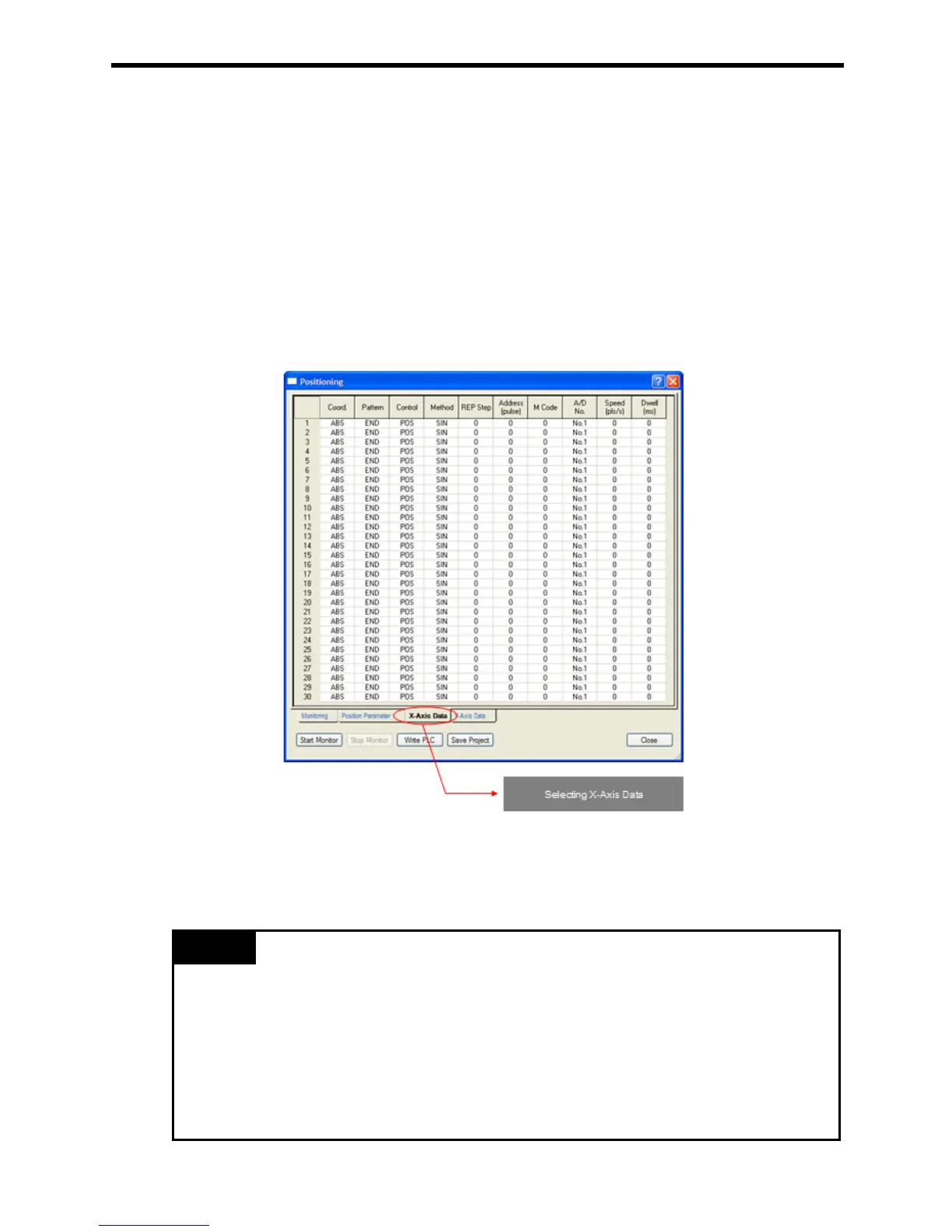 • If you select the ‘axis X data’ or ‘axis Y data’ tabs in the positioning monitoring package, the window is