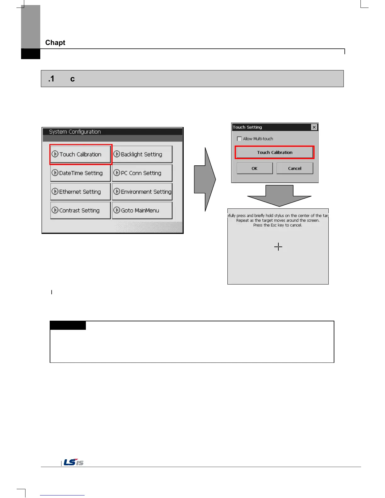 (1) XGT Panel’s Touch Calibration setting is basically set. If Touch location error is big, adjusting menu with touch can be