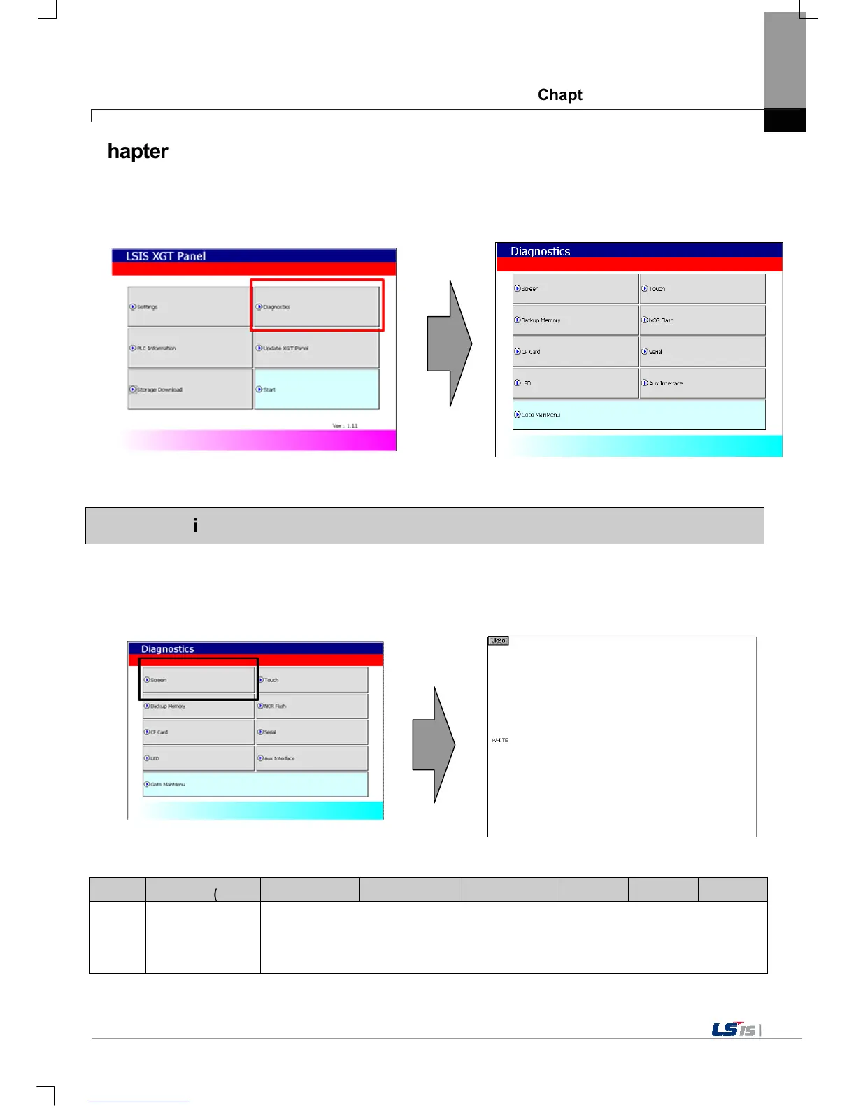 It describes the diagnosis function for XGT Panel’s communication terminal, screen and touch function.