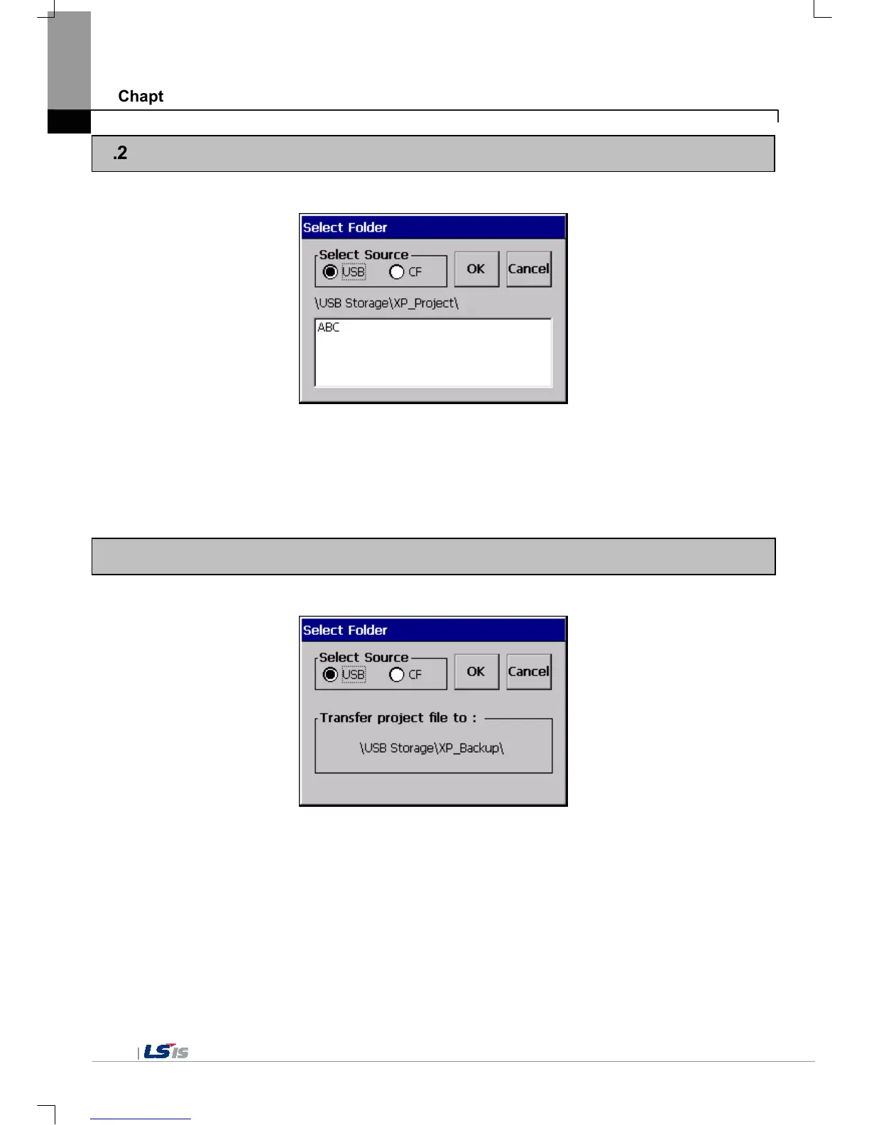 2. In case of selecting [USB], the directory list under the path, \USB Storage\XP_Project\ shows. In case of selecting [CF],