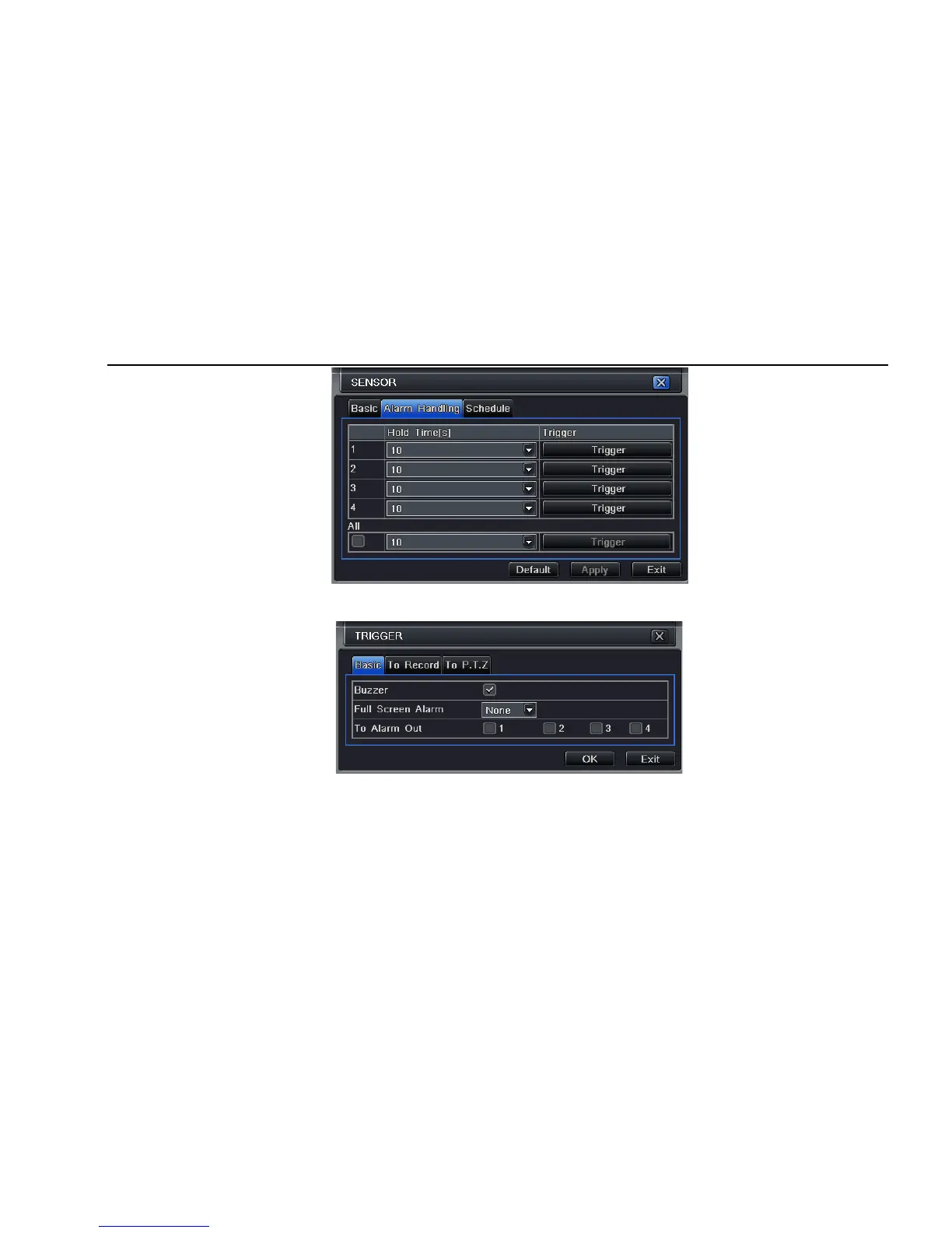 To alarm out: tick off the channel, there will be triggered alarm out in the designated channel. Click OK button to save the setting; click Exit