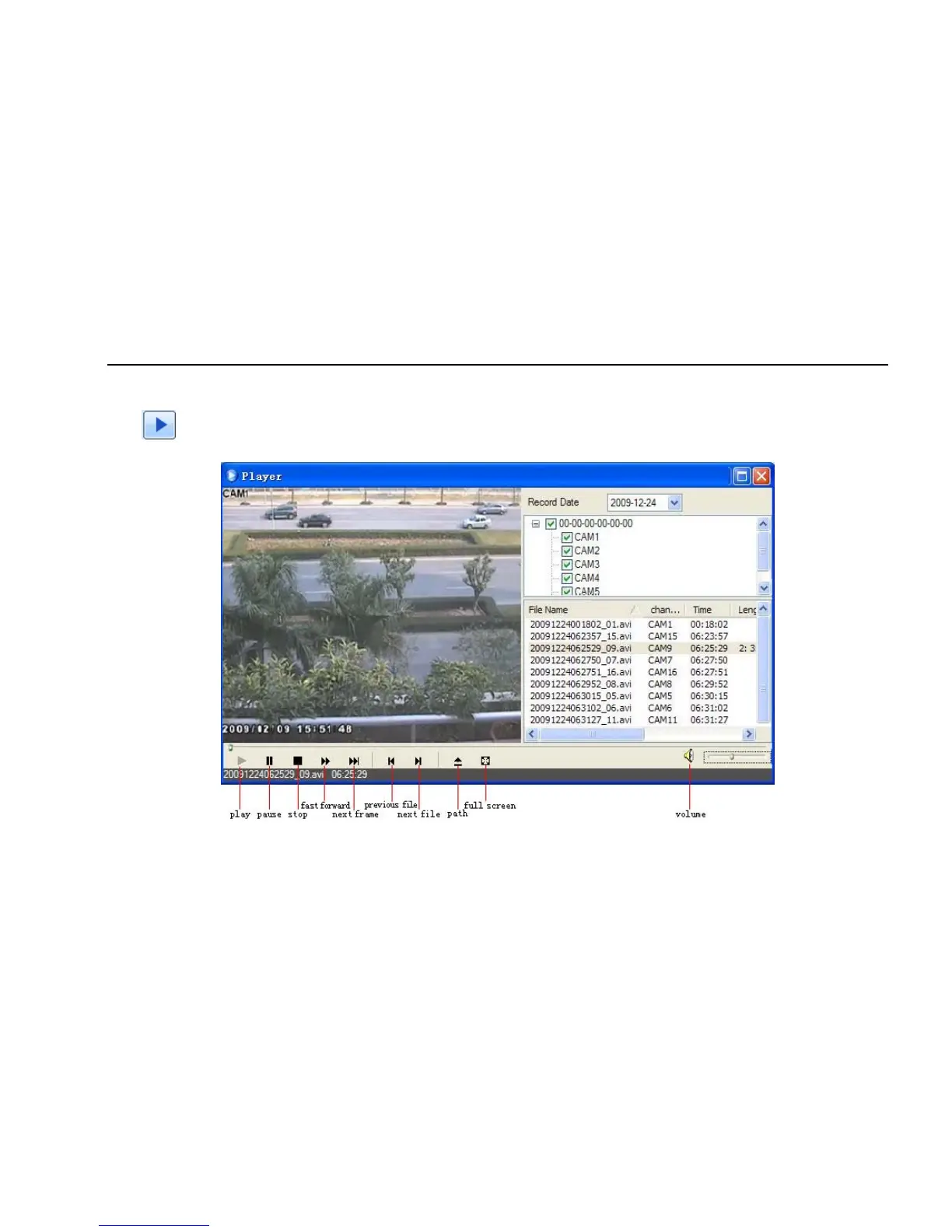 Select the record date and channels; double-click the file name in the record file list box, user can play that file and preview the picture.