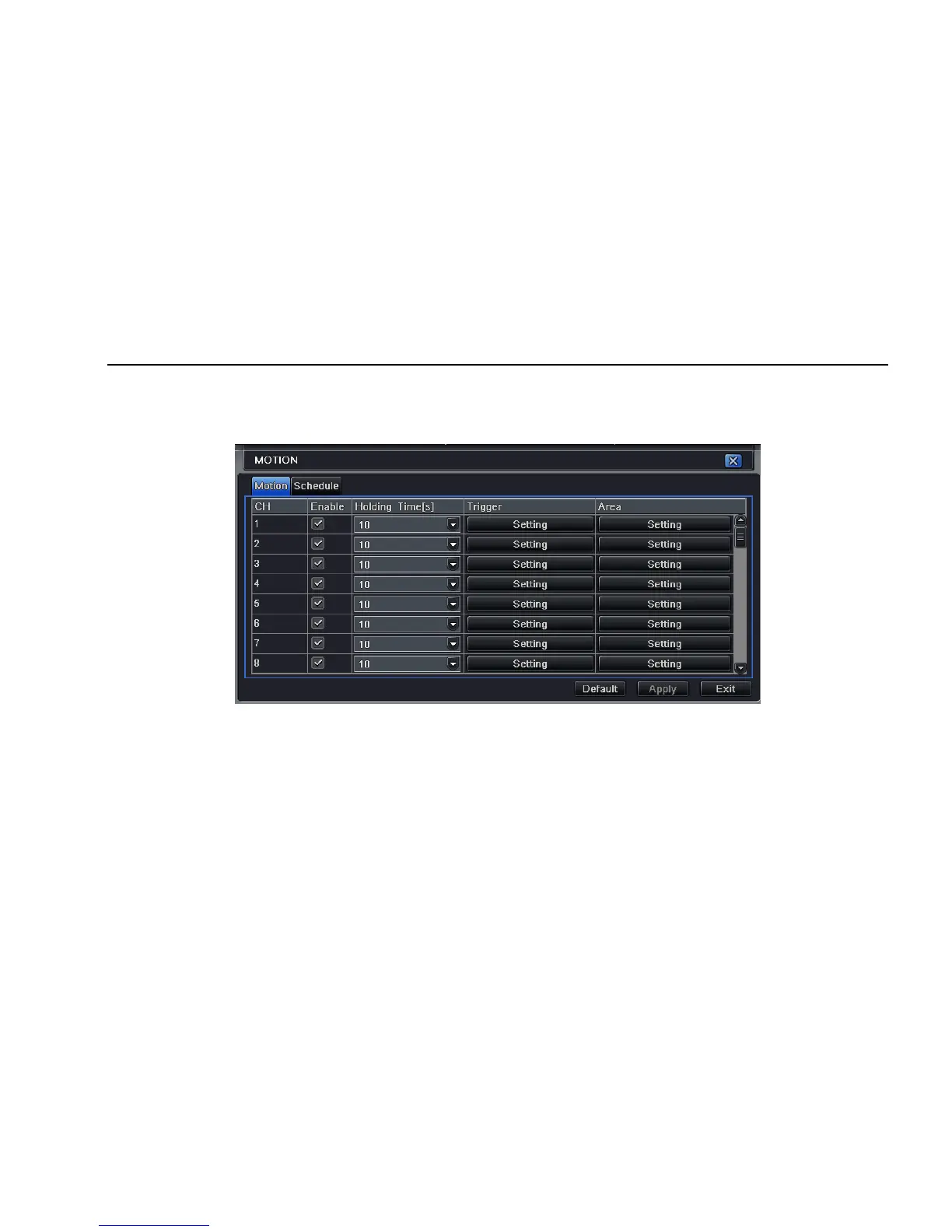 Step1: enter into system configurationÆalarm configurationÆmotion; refer to Fig 4-23: