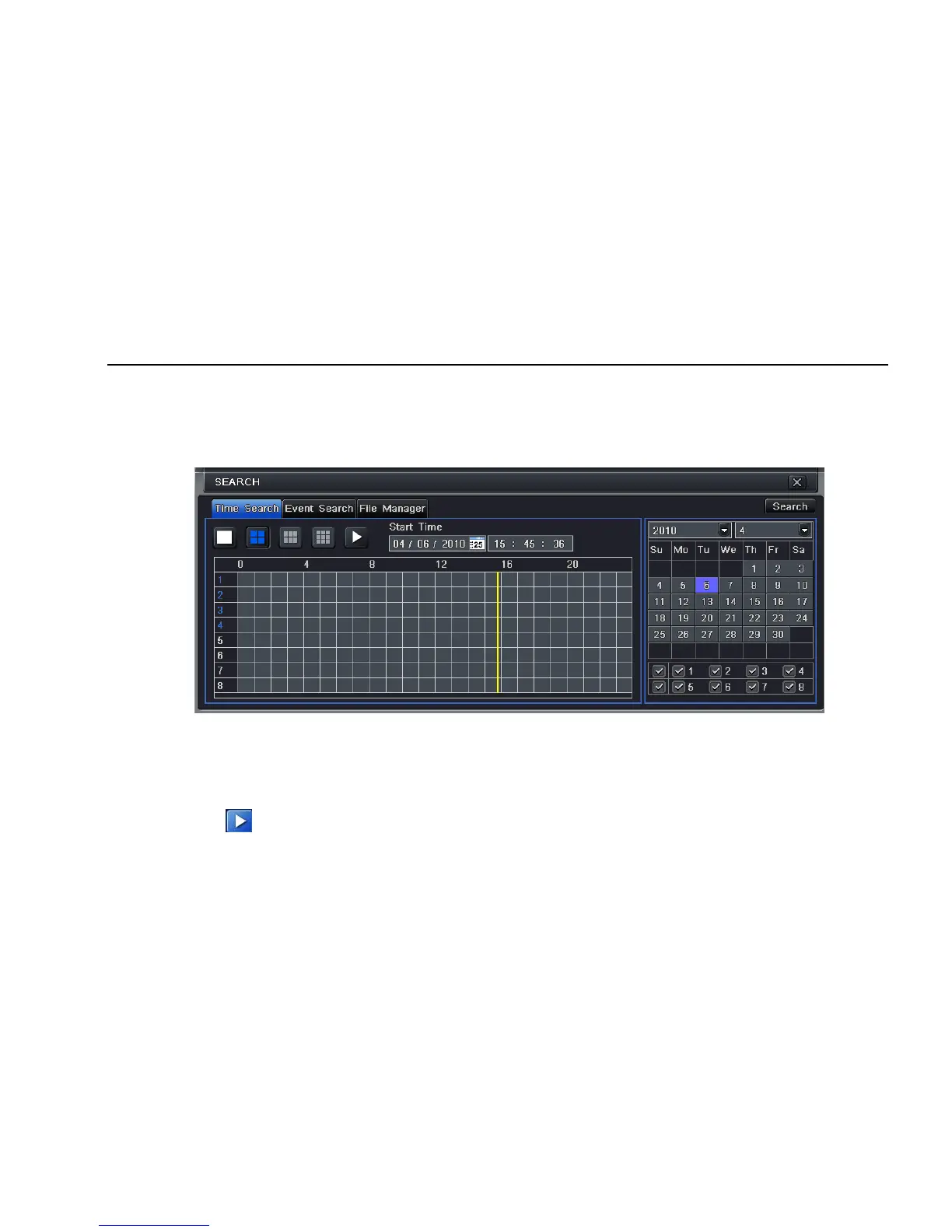 Step3: select a date, press Search button, click the time grid to set the play start time or input play record time manually. The selected time