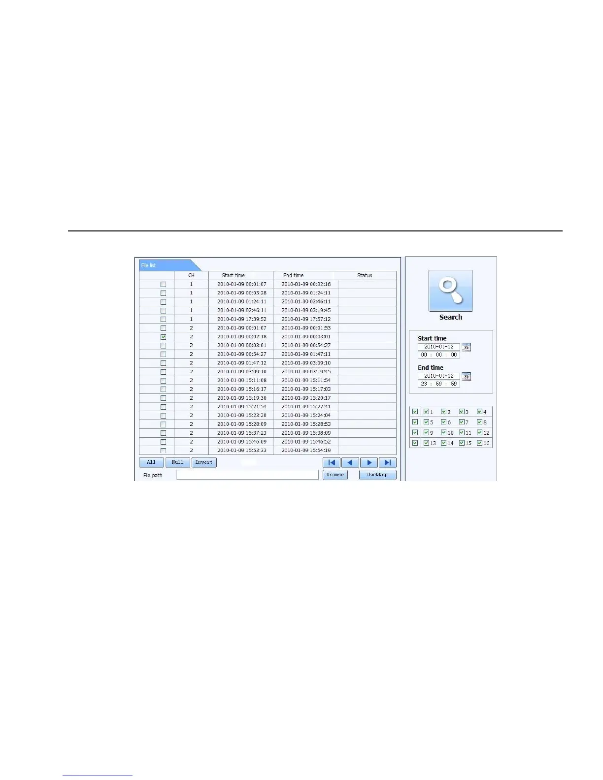 Step1: select channels, set the start and end time, then click “search’ button, the file information will be displayed in the file list box