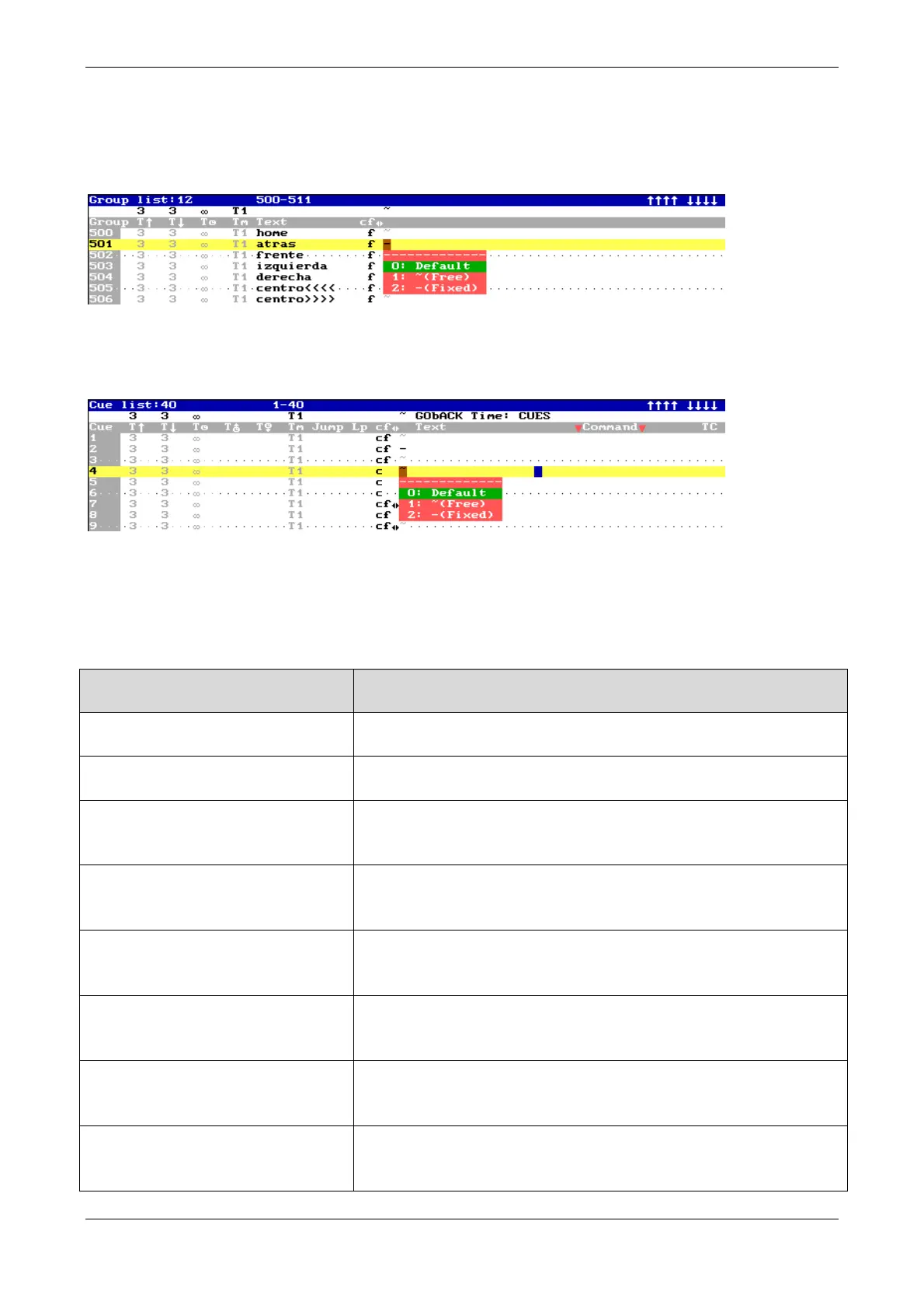 Opens a table with the cues and groups where this fixture is