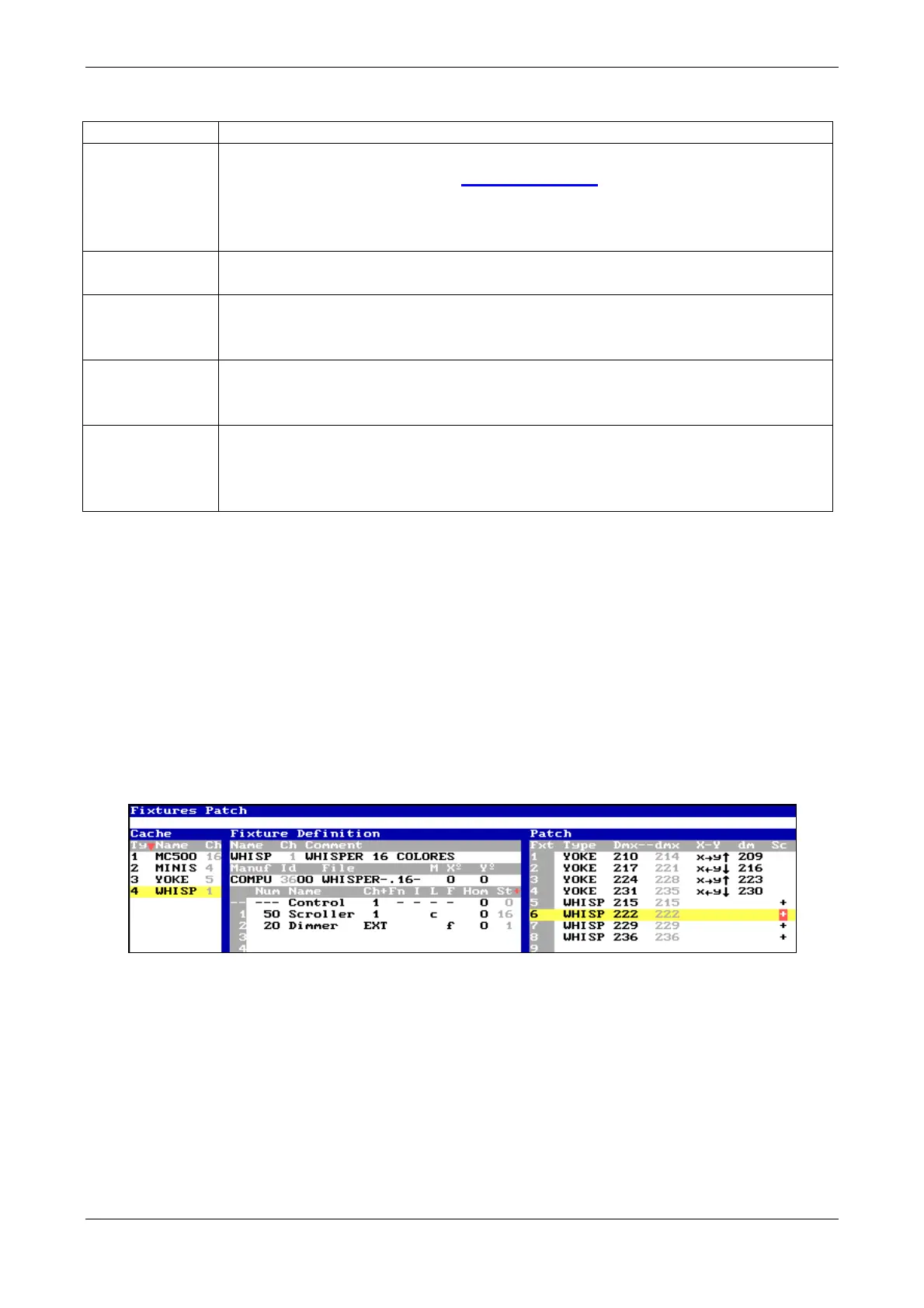 Each Patch line has the configuration of a moving light, scroller, etc (fixture) that is defined as: