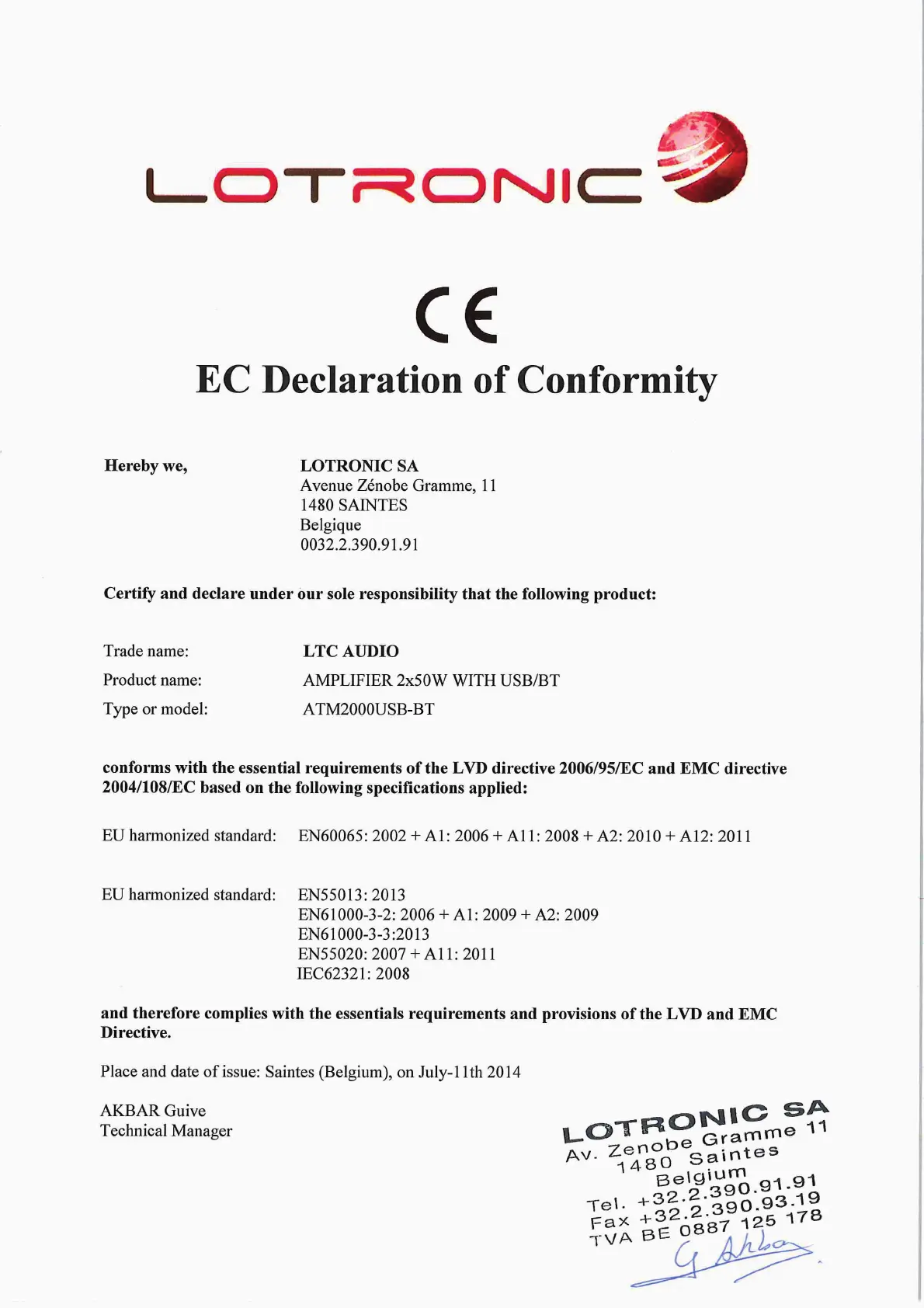 Ltc Audio ATM2000USB-BT - EC Declaration of Conformity; Compliance and Standards