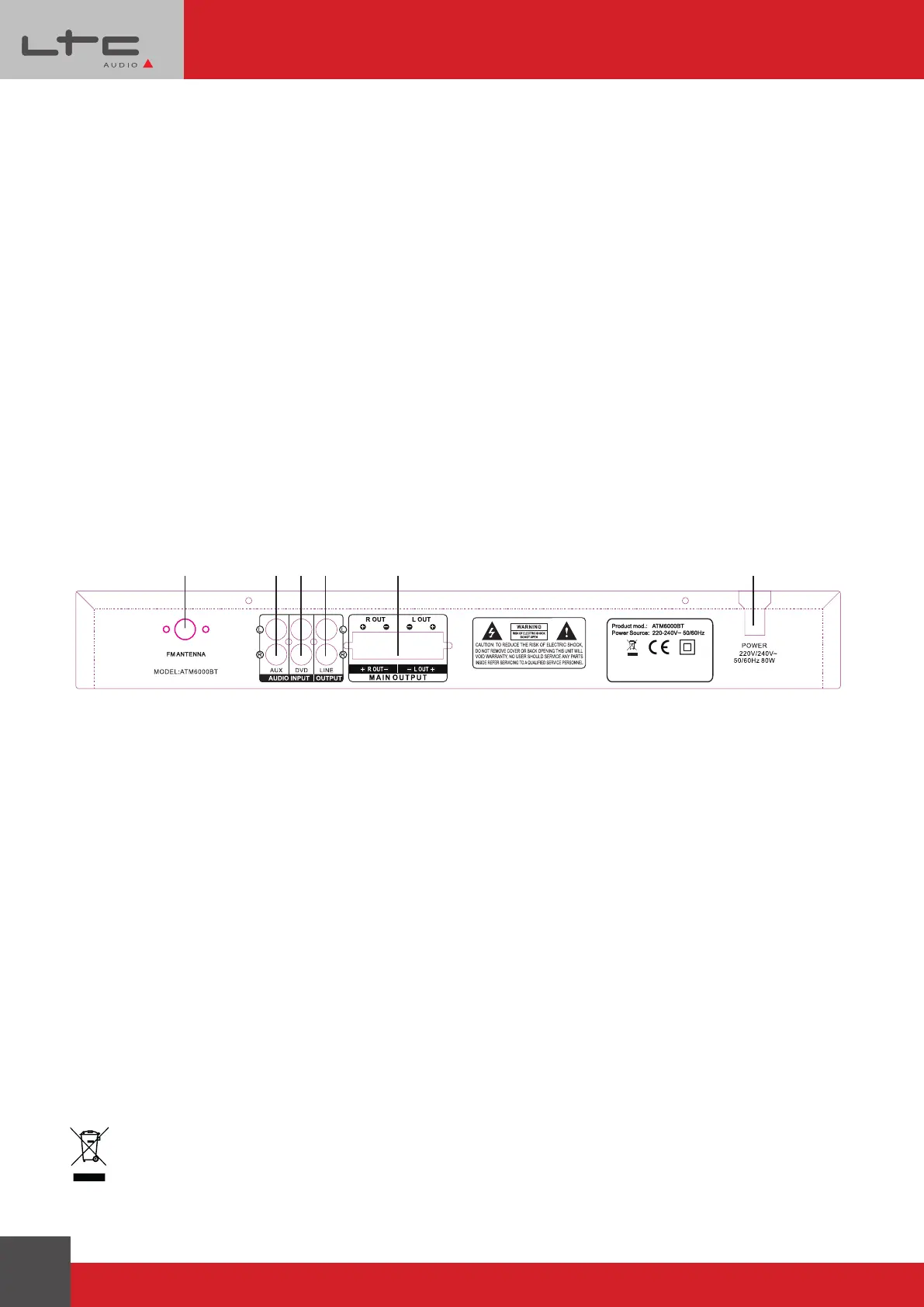 LINE OUTPUT: Conecte esta clavija a la entrada de otro amplicador o de un bae amplicado. Esta señal es a