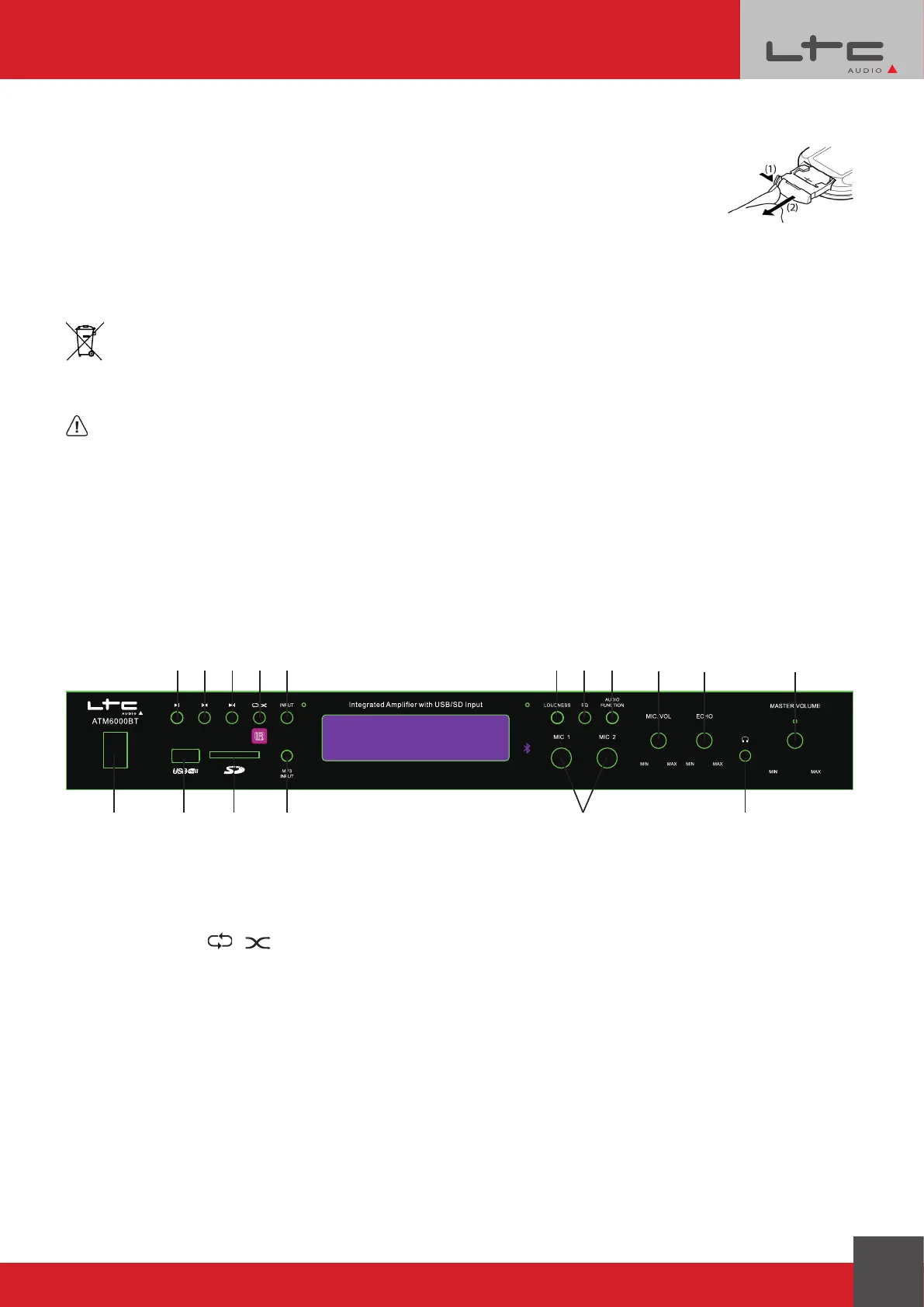 2. Play/Pause: Press this button to play the signal from USB/SD, Bluetooth. Press again to pause